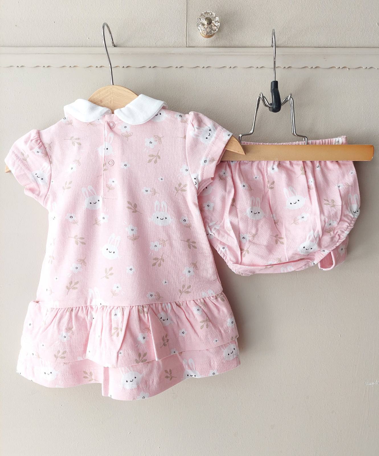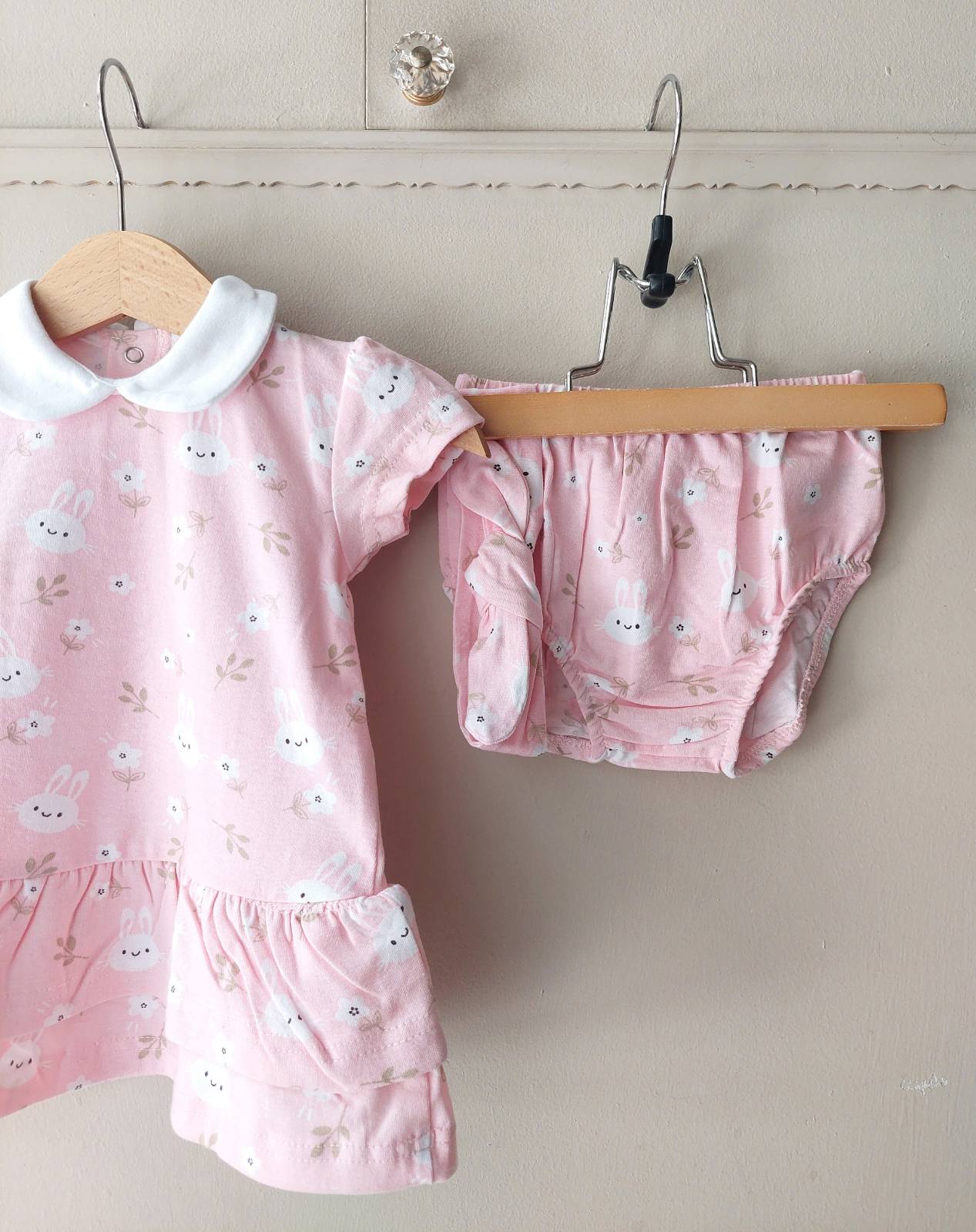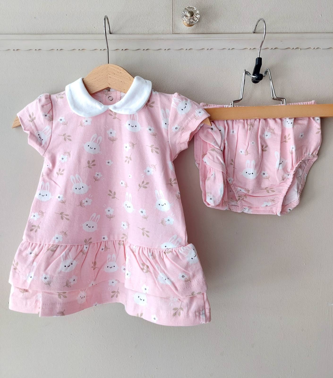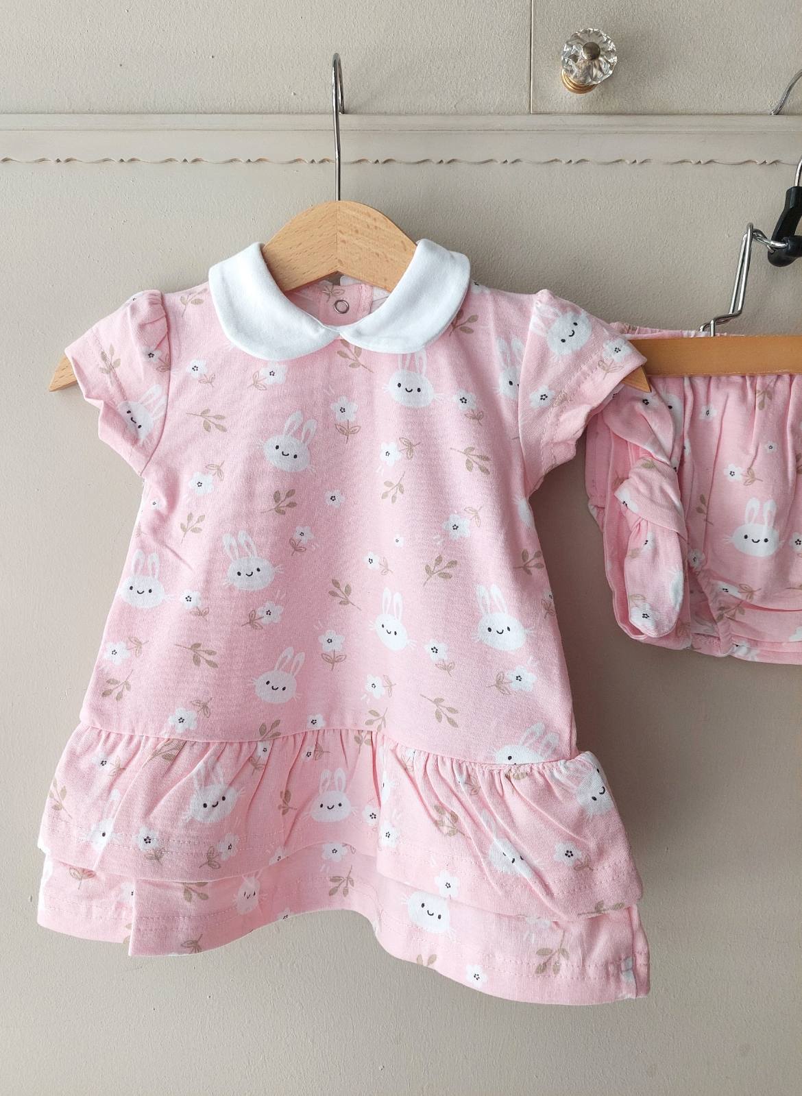 Το ροζ φορεματάκι με παιχνιδιάρικο print λαγουδάκια, λευκό γιακαδάκι και βολάν στο τελείωμα συνδυάζεται