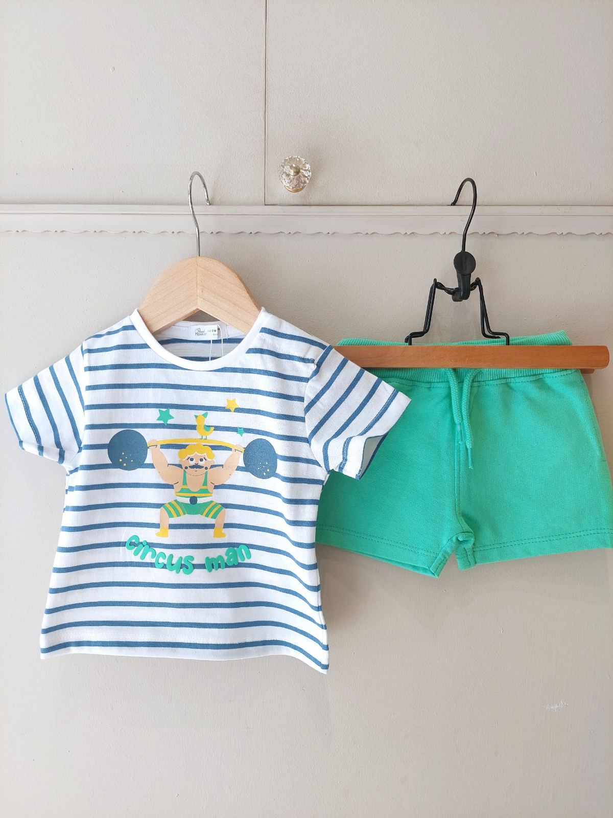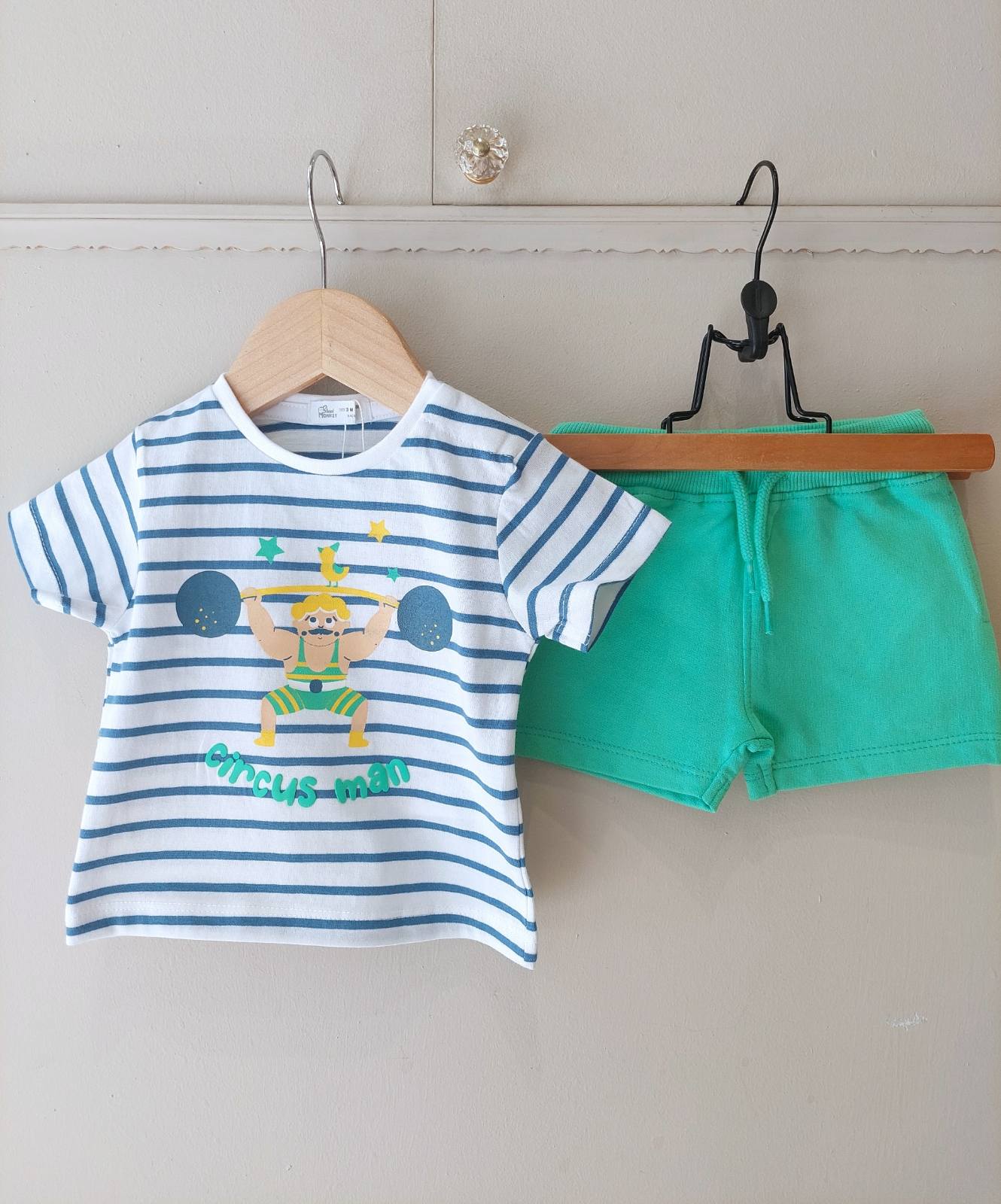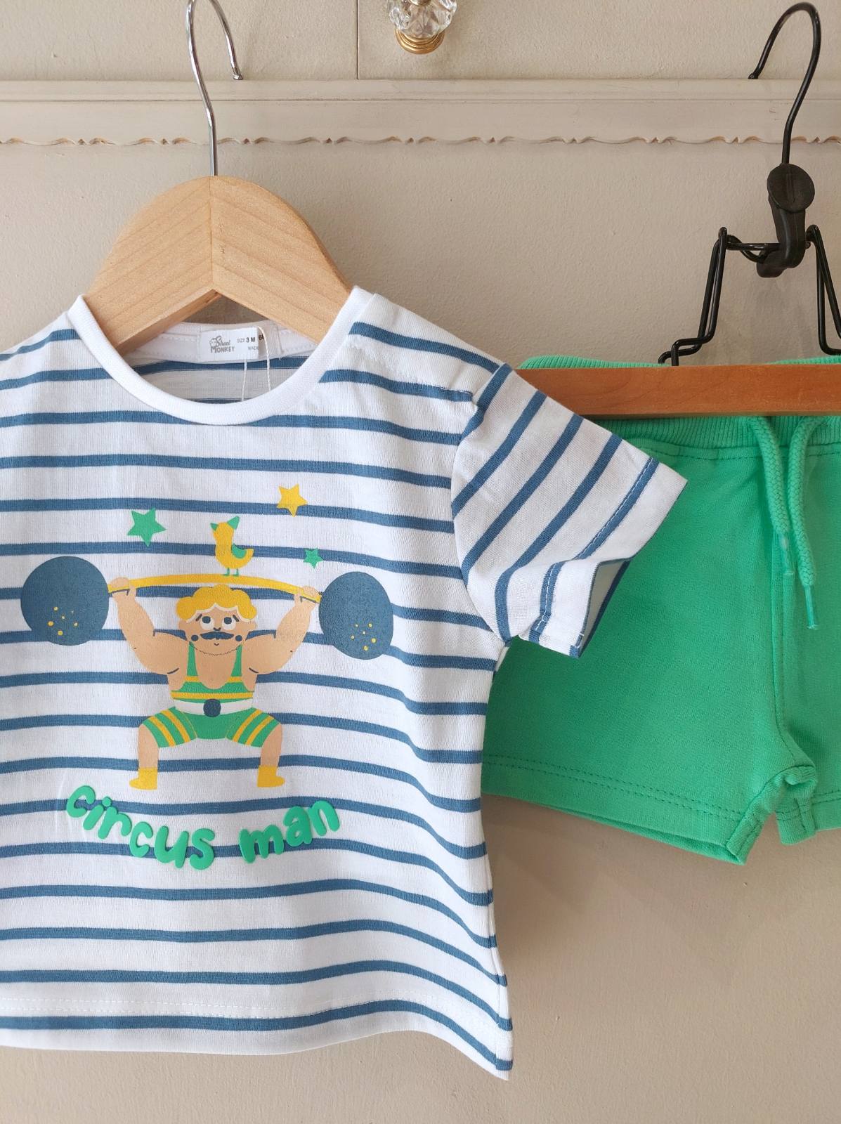 Φτιαγμένο από μαλακό jersey υφασμα περιλαμβάνει σορτσάκι σε πράσινο χρώμα και ριγέ μπλε μπλουζάκι.