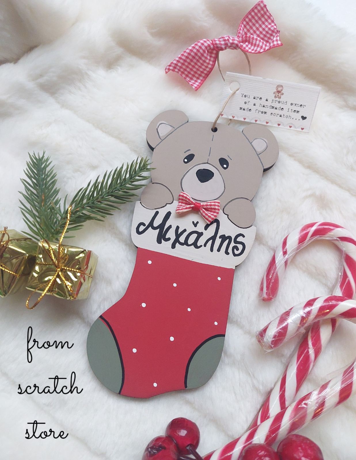 Κωδικός προϊόντος: 56784 Κατηγορίες: Christmas, Santa's workshop Ετικέτες: bear in a sock, christmas, decoration, from scratch store, handmade, wooden