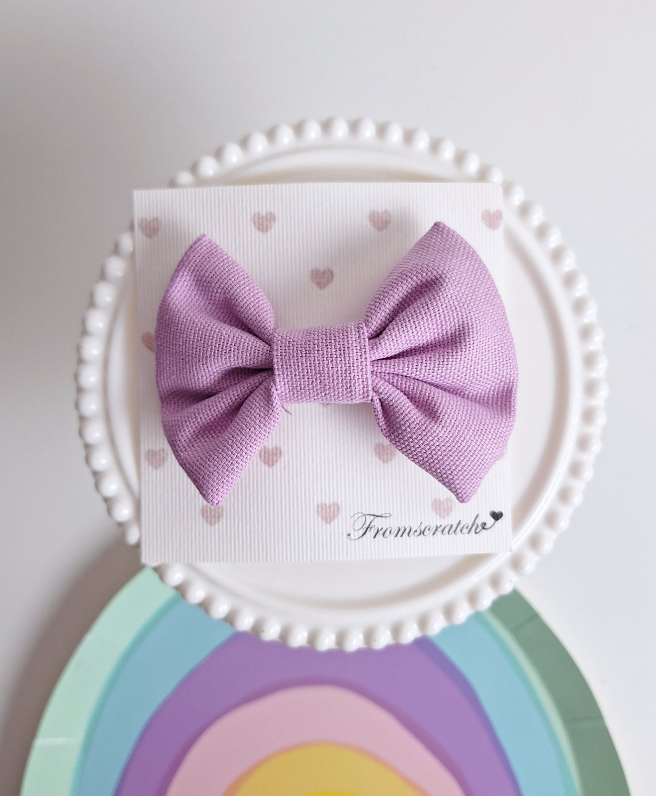 Χειροποίητο υφασμάτινο κλιπ μαλλιών σε σχήμα φιόγκου στην απόλυτη τάση της σεζόν: το λιλά. Κατασκευασμένο από ύφασμα με διακριτική υφή (textured fabric), προσφέρει σταθερότητα και κομψότητα σε κάθε χτένισμα. Ο λιτός και απέριττος σχεδιασμός του το καθιστά ιδανικό για καθημερινή χρήση στο σχολείο ή τη βόλτα, αλλά και για πιο επίσημες περιστάσεις όπου η λεπτομέρεια κάνει τη διαφορά. Ένα απαραίτητο αξεσουάρ για κάθε κοριτσίστικη συλλογή.