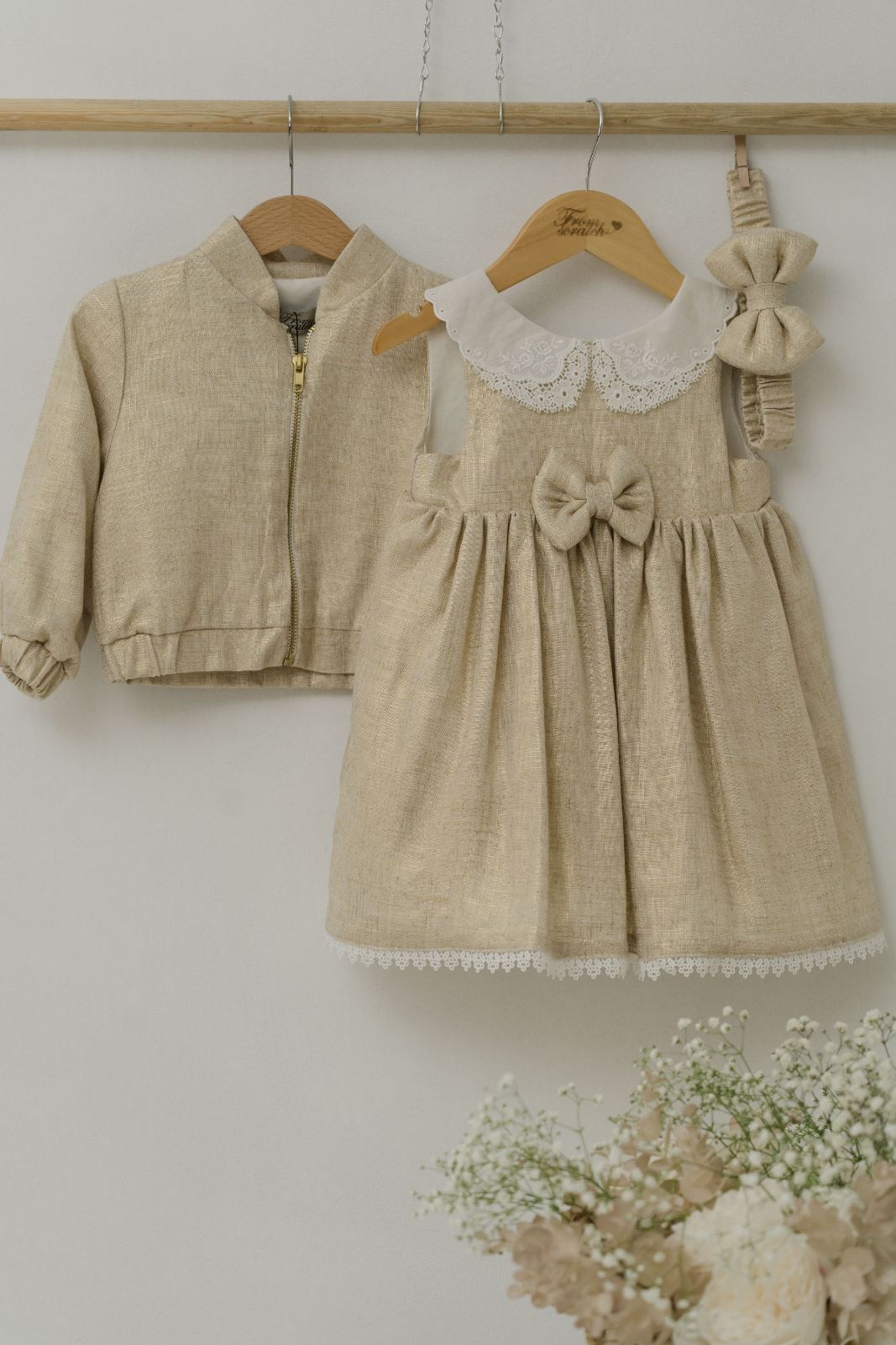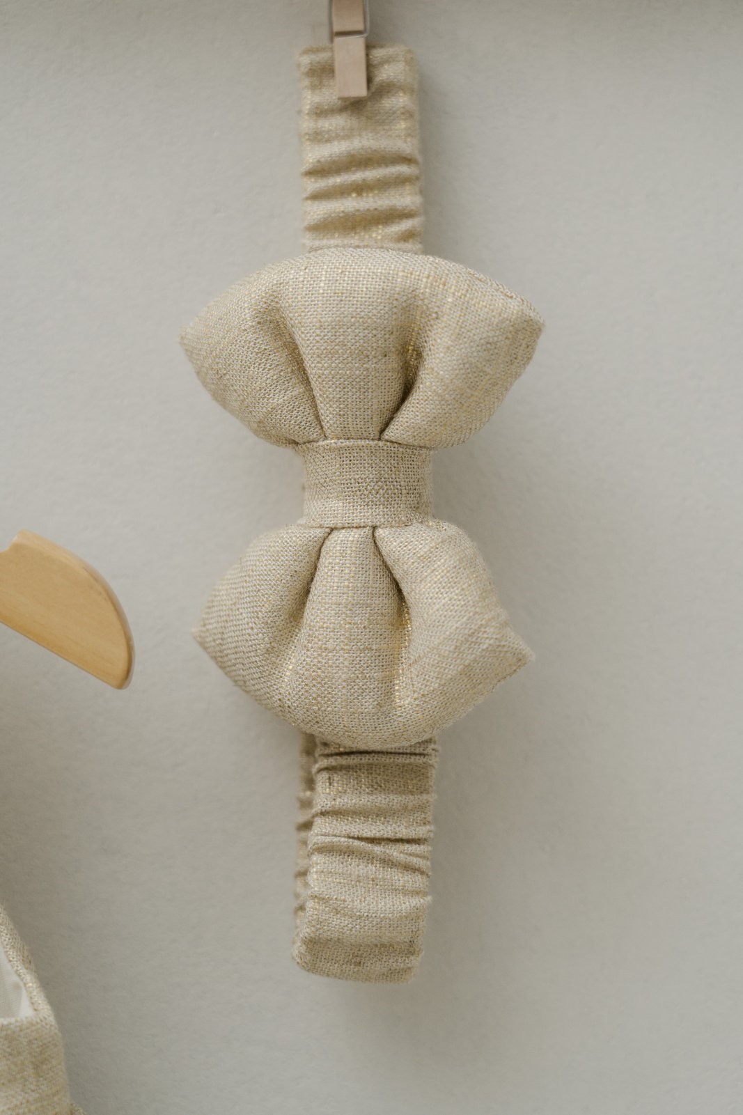 Στη μεσούλα ένα γλυκό φιογκάκι ασορτί με την κορδέλα φιογκάκι για τα μαλλάκια που περιλαμβάνεται για το απόλυτα ταιριαστό αποτέλεσμα.