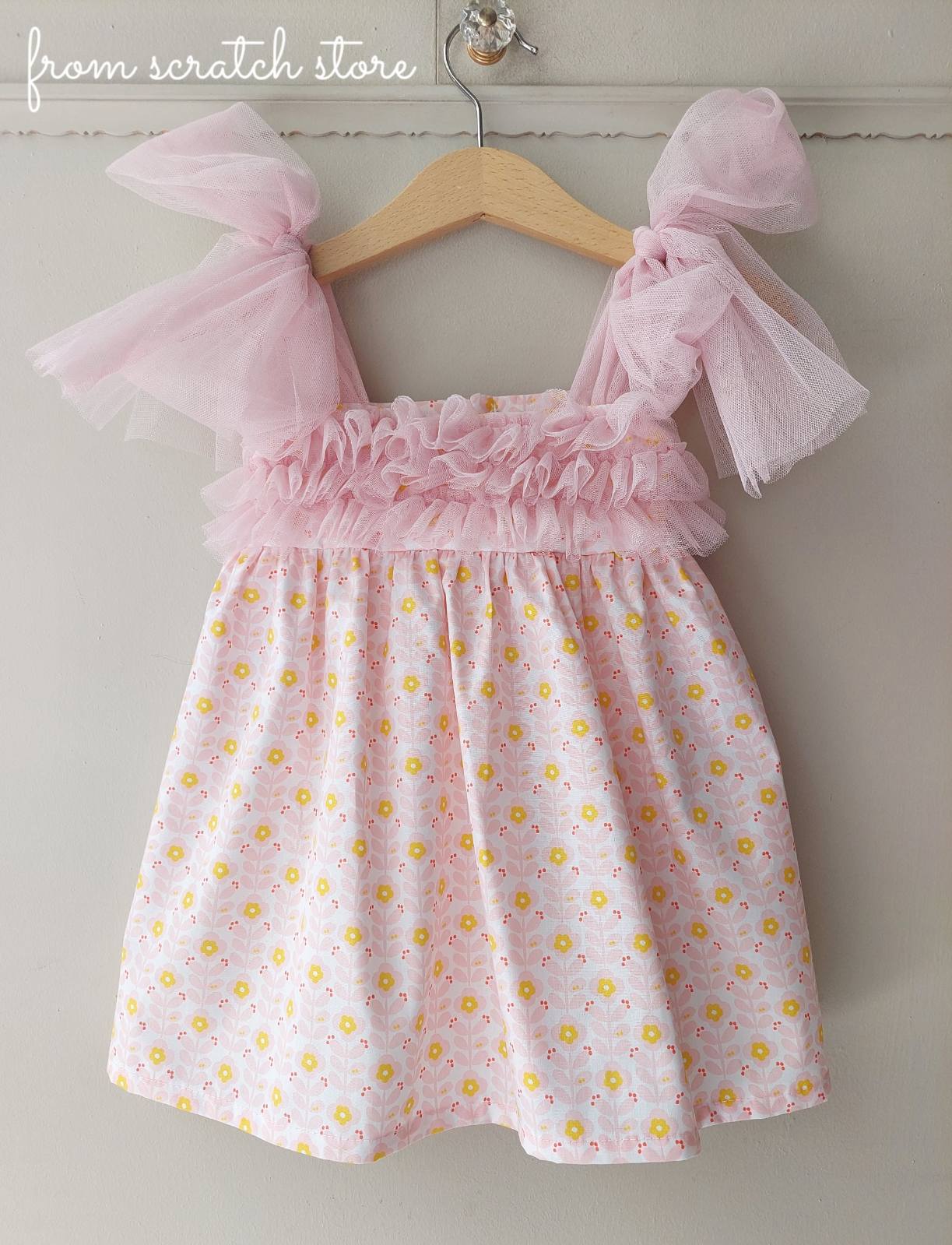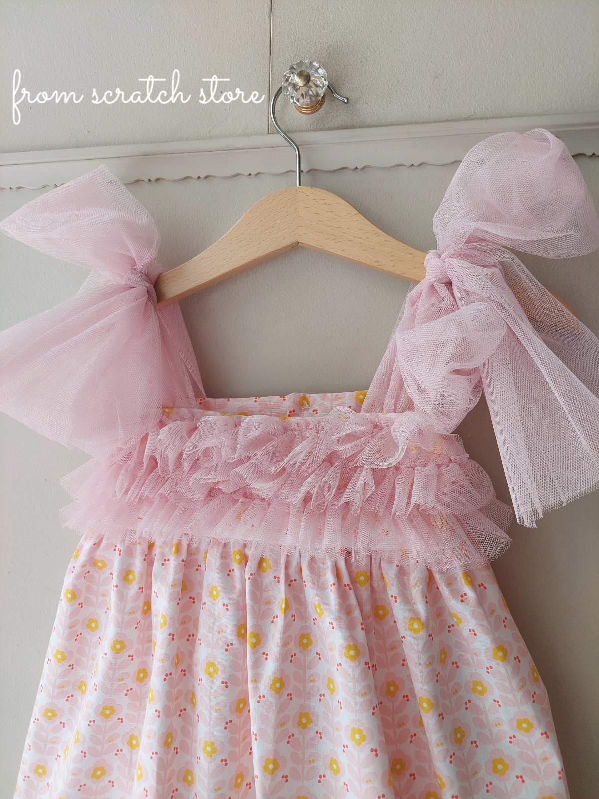 Ένα φορεματάκι με υπέροχο ροζ λεμονί print και φοβερές τούλινες λεπτομέρειες με βολανάκι στο τοπάκι και πιάσιμο με τούλινο φιογκάκι στα μανίκια.