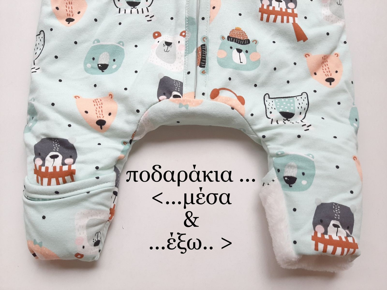 Με τέχνασμα στα χεράκια και ποδαράκια μπορείτε εσείς να ορίσετε εάν θέλετε τα άκρα έξω ή μέσα για να θωρακίζεται η θερμοκρασία. Πως γίνεται? Απλά βάλτε ή βγάλτε τα χεράκια και ποδαράκια από τις ειδικές γούνινες τσεπούλες χωρίς να κουβαλάτε μαζί σας έξτρα παπουτσάκια η γαντάκια. Ιδιαίτερα όμορφη είναι και η λεπτομέρεια με τα αυτάκια στην κουκούλα.