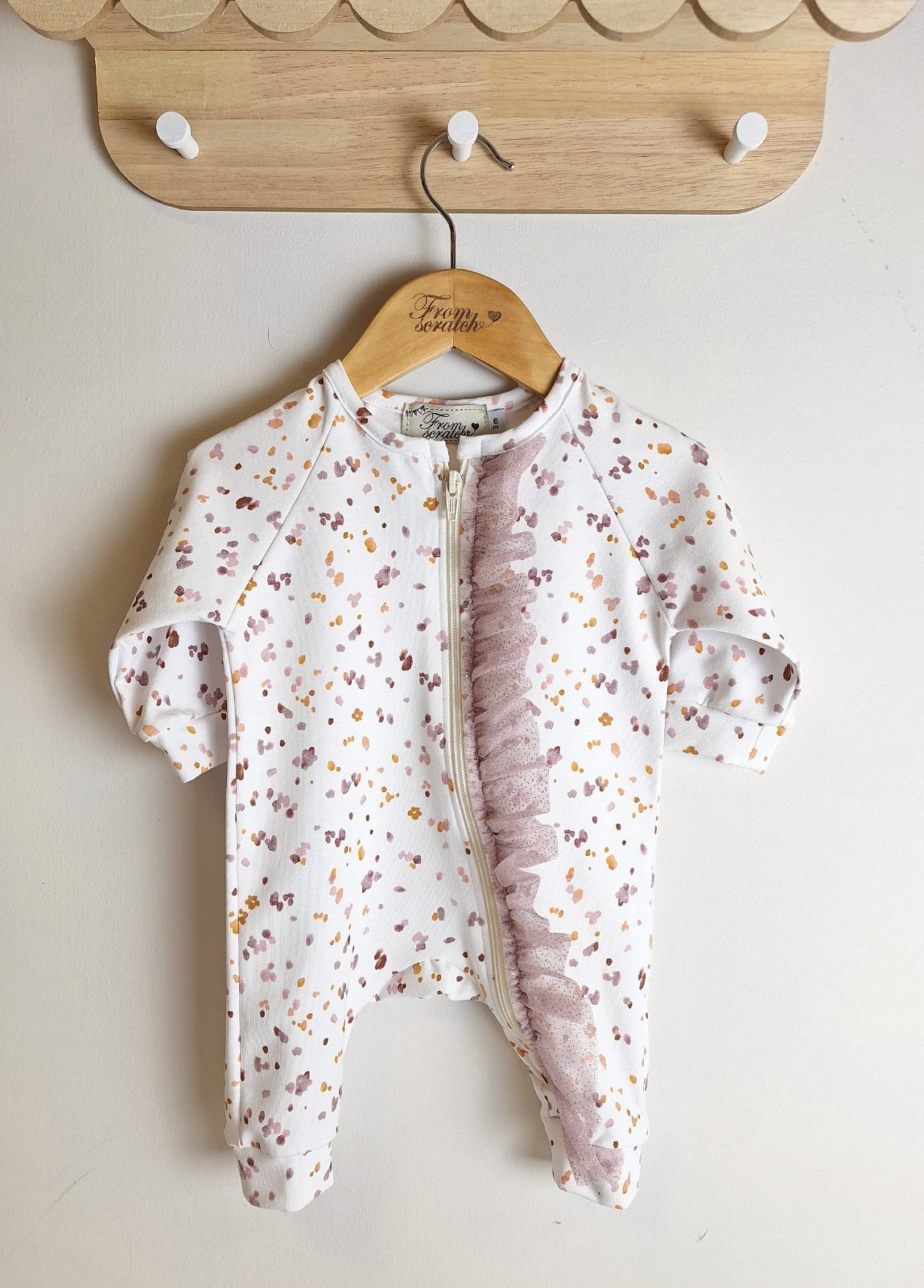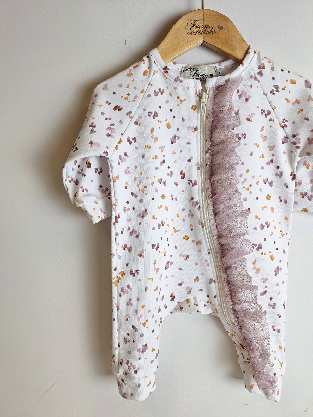 Το βρεφικό φορμάκι Splashes συνδυάζει την απόλυτη άνεση με μια παραμυθένια αισθητική. Κατασκευασμένο από 100% ποιοτικό βαμβακερό ύφασμα, επιτρέπει στο δέρμα του μωρού να αναπνέει, ενώ το πρακτικό φερμουάρ κατά μήκος του σώματος διευκολύνει το ντύσιμο και την αλλαγή της πάνας. Ξεχωρίζει για το υπέροχο μοτίβο με “πιτσιλιές” σε γήινες αποχρώσεις και τη μοναδική λεπτομέρεια από τούλινο βολάν που διατρέχει το μπροστινό μέρος. Ένα κομμάτι που προσφέρει ελευθερία κινήσεων και απαράμιλλο στυλ, ιδανικό για τις καθημερινές στιγμές αλλά και για πιο επίσημες εμφανίσεις.