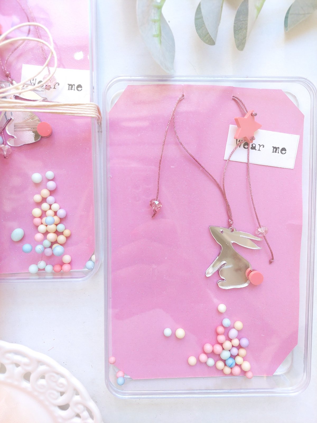 λαγουδάκι μενταγιόν σε κουτί, έτοιμο να γίνει ο νέος αγαπημένος φίλος του παιδιού.