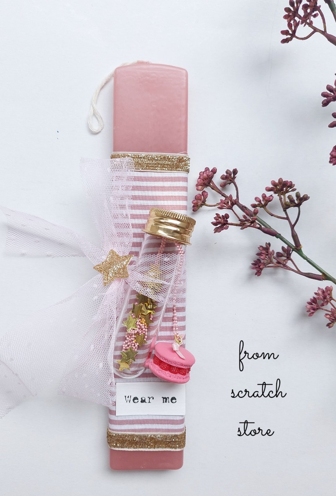 -Ροζ πασχαλινή λαμπάδα με ριγέ ύφασμα και χρυσές λεπτομέρειες