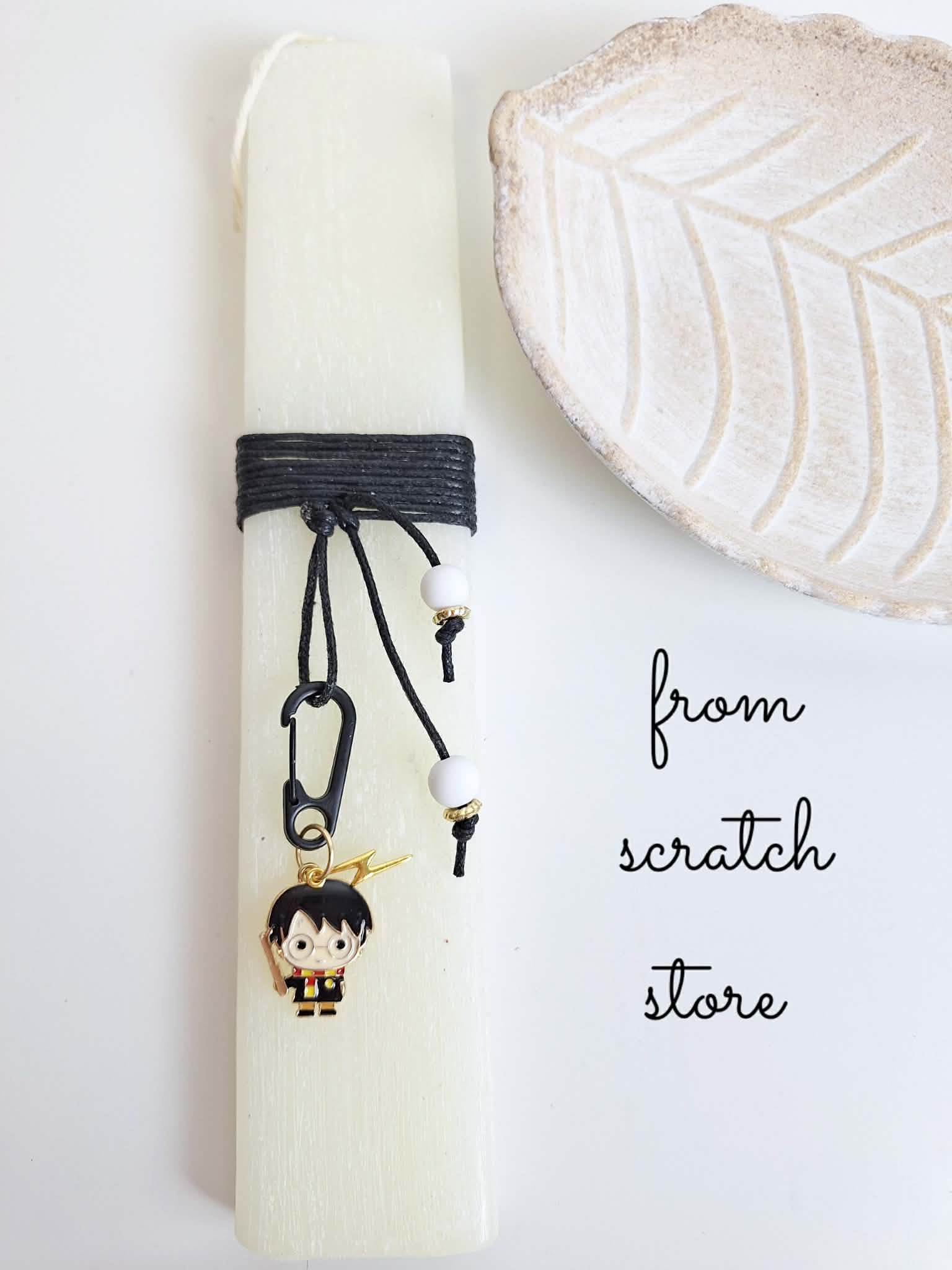Το highlight της λαμπάδας είναι το περίτεχνο μεταλλικό στοιχείο (charm) του Harry Potter, με τον χαρακτηριστικό κεραυνό και το ραβδί του,