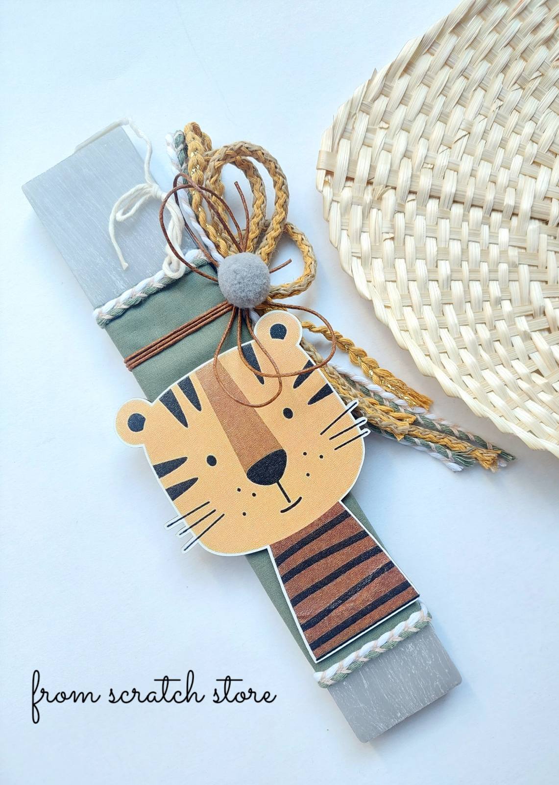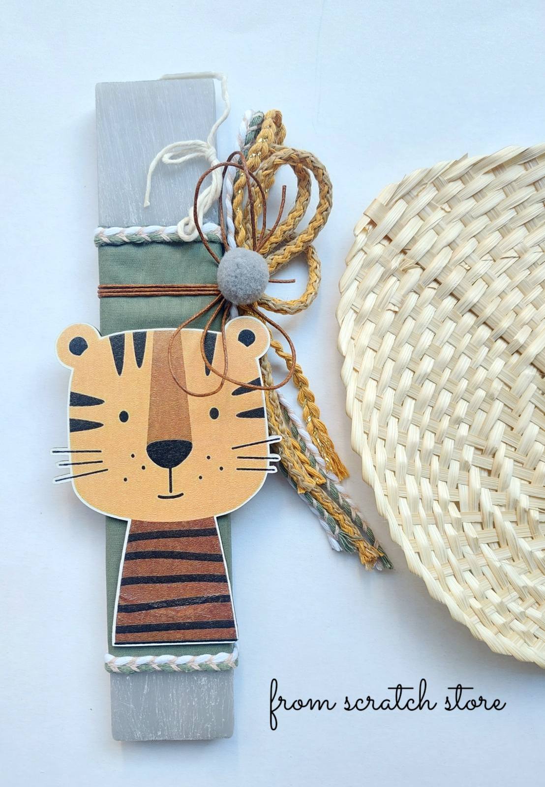 Μια ιδιαίτερη χειροποίητη πασχαλινή λαμπάδα 25 εκατοστών με ξύλινη διακοσμητική φιγούρα λιονταράκι, που θα ξετρελάνει τους μικρούς μας φίλους!