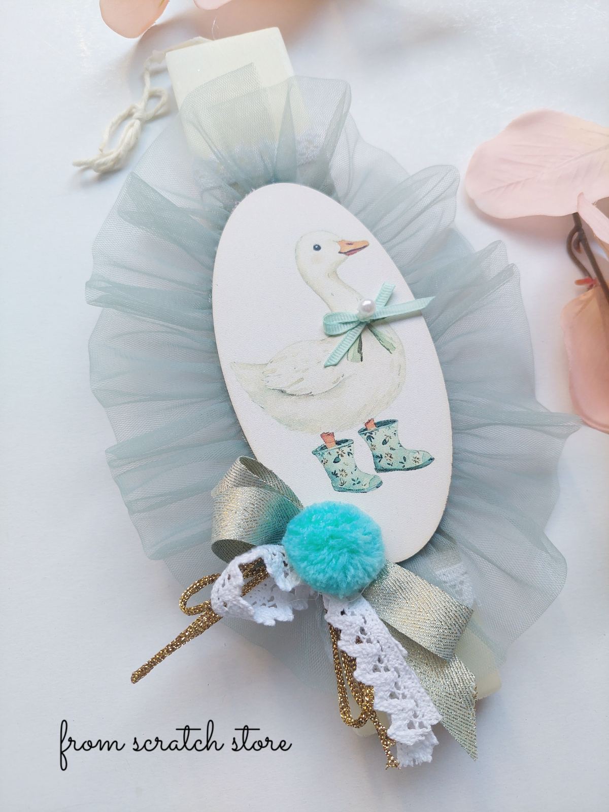 διακοσμημένη με μια υπέροχη ξύλινη παράσταση μιας χαριτωμένης πάπιας που φοράει μικροσκοπικές γαλότσες.