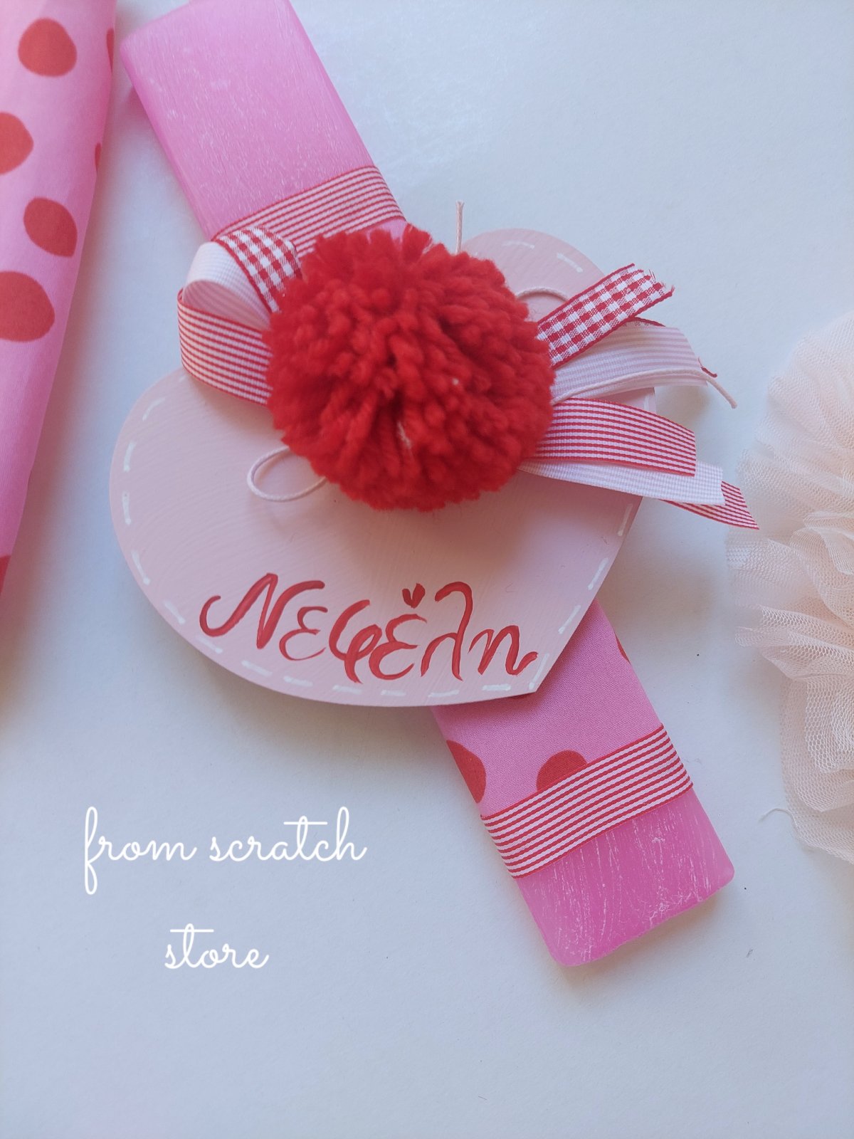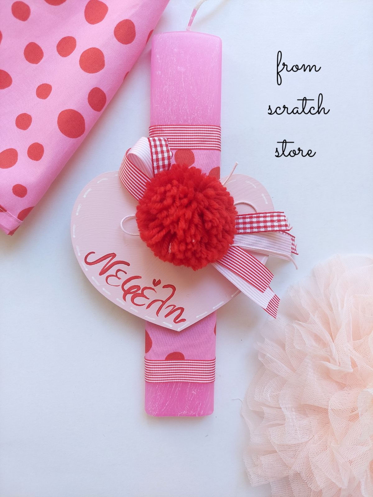 🕯️ Ροζ πασχαλινή λαμπάδα στολισμένη με κόκκινη pom pom