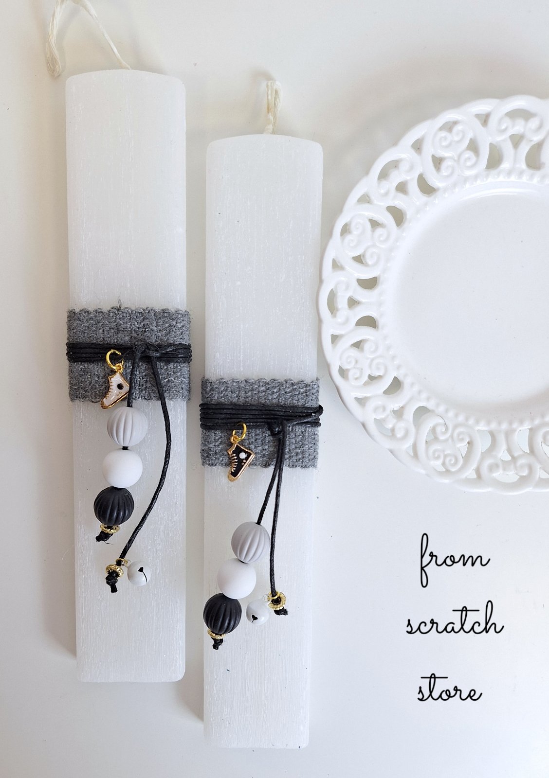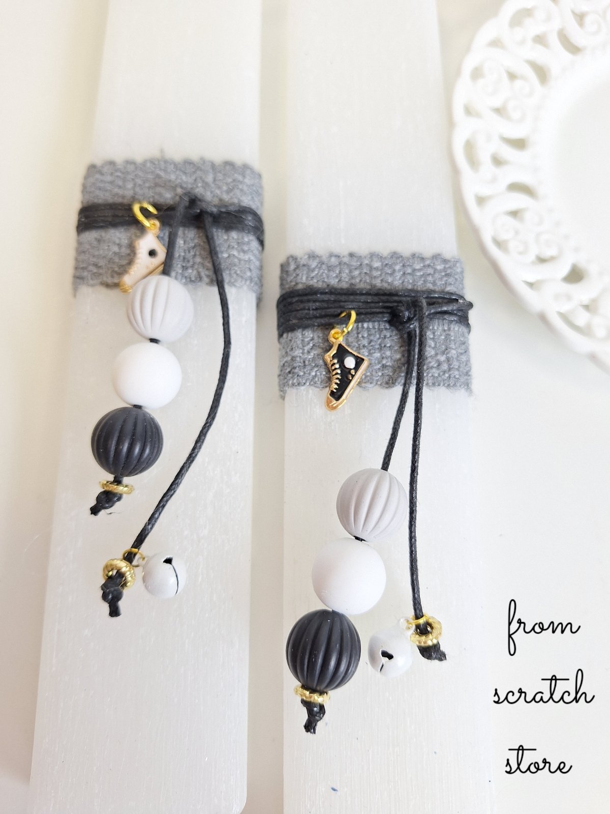 Χειροποίητη αρωματική πασχαλινή λαμπάδα “Sneakers Charm” σε minimal, urban στυλ. Διακοσμημένη με γκρι πλεκτό ύφασμα, μαύρα κορδόνια και κρεμαστό διακοσμητικό με χάντρες και ένα στιλάτο charm σε σχήμα sneaker. Διατίθεται σε δύο επιλογές χρωμάτων για το charm, λευκό ή μαύρο, για να διαλέξετε αυτό που σας ταιριάζει. Μια cool και πρωτότυπη επιλογή για το βαφτιστήρι που θέλει να ξεχωρίζει με το στυλ του το βράδυ της Ανάστασης.