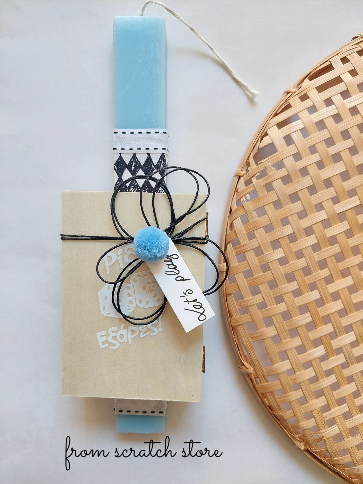 Αποτελείται από μια αρωματική, χειροποίητη λαμπάδα 25 εκατοστών, διακοσμημένη με ένα μίνι τάβλι