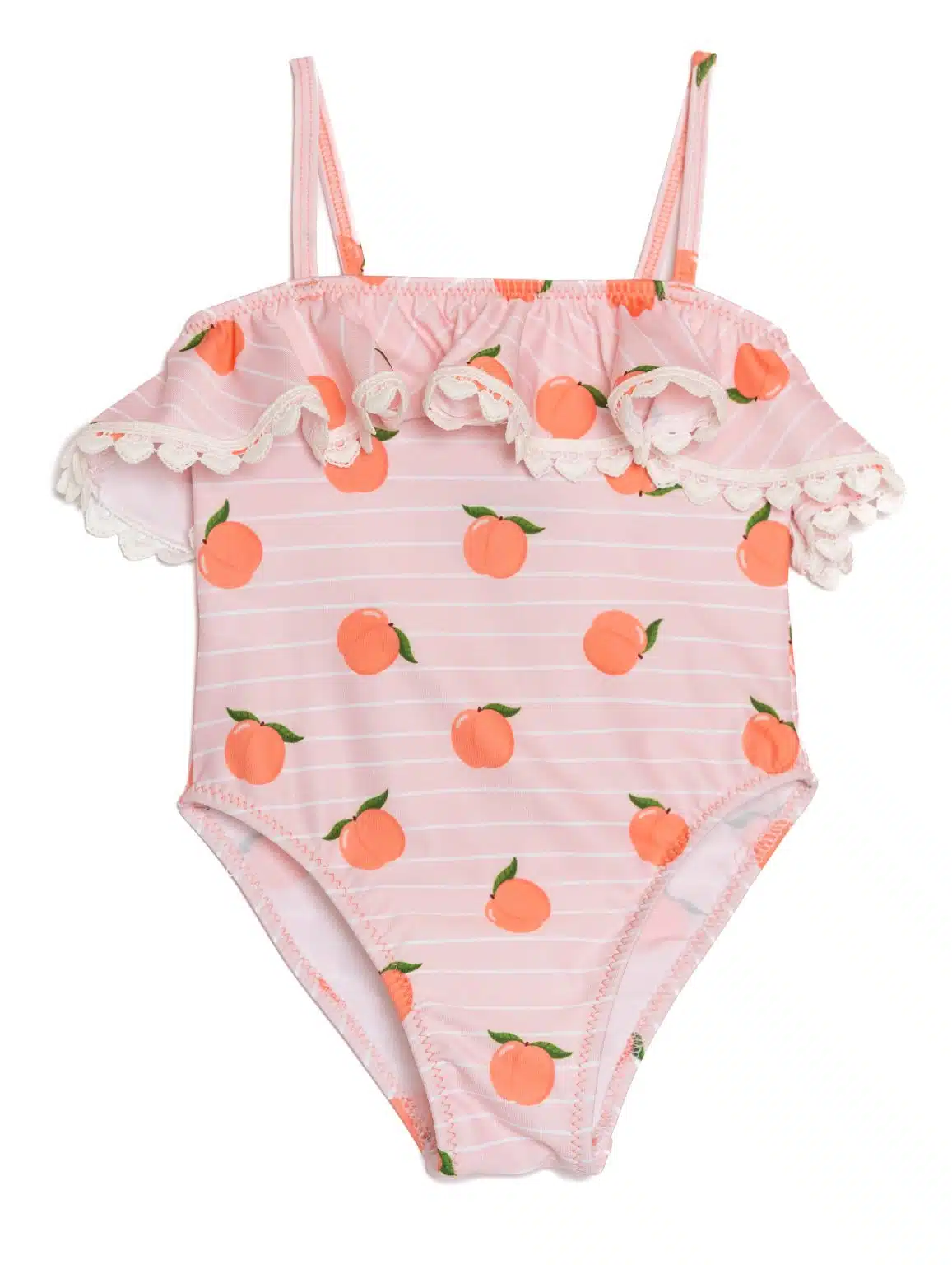 Χαριτωμένο και παιχνιδιάρικο, το παιδικό ολόσωμο μαγιό Peaches με ροζ ρίγες και μοτίβο από ροδάκινα