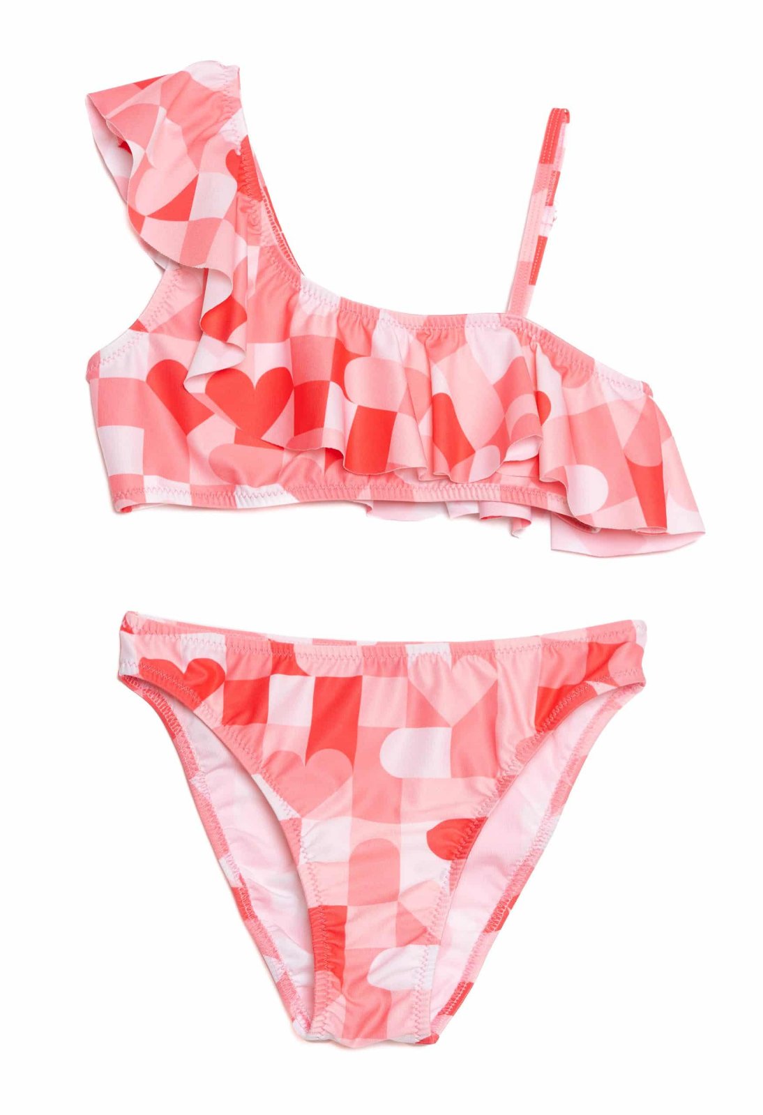 Το μπικίνι Pink Hearts ξεχωρίζει με το γεωμετρικό σχέδιο από καρδιές σε ροζ και κόκκινους τόνους και μια μοντέρνα, ασύμμετρη σχεδίαση με φραμπαλά.