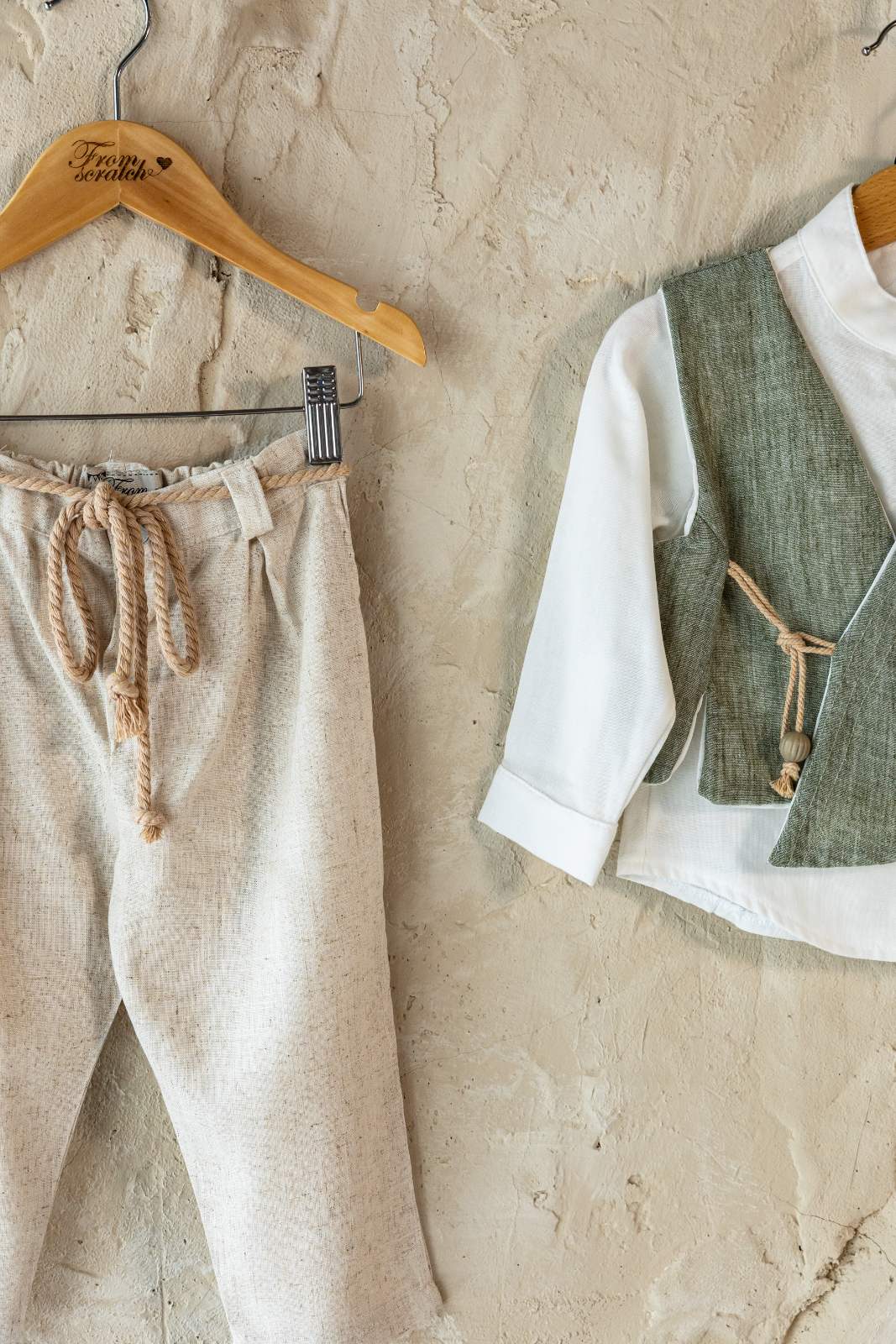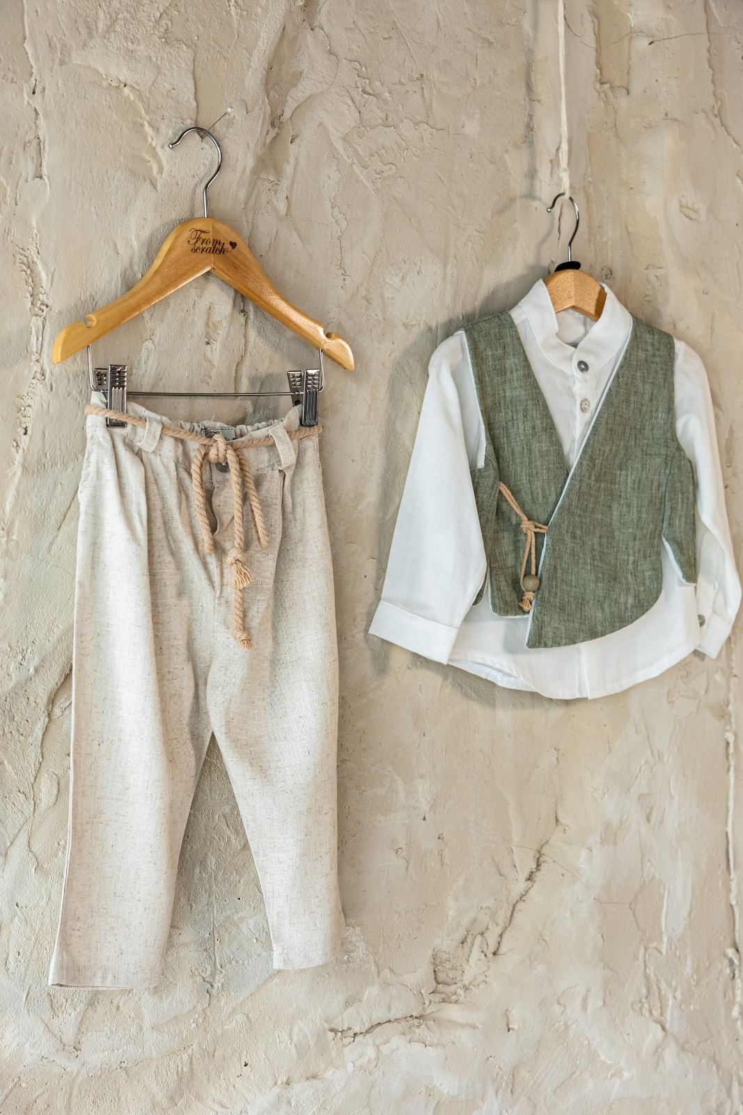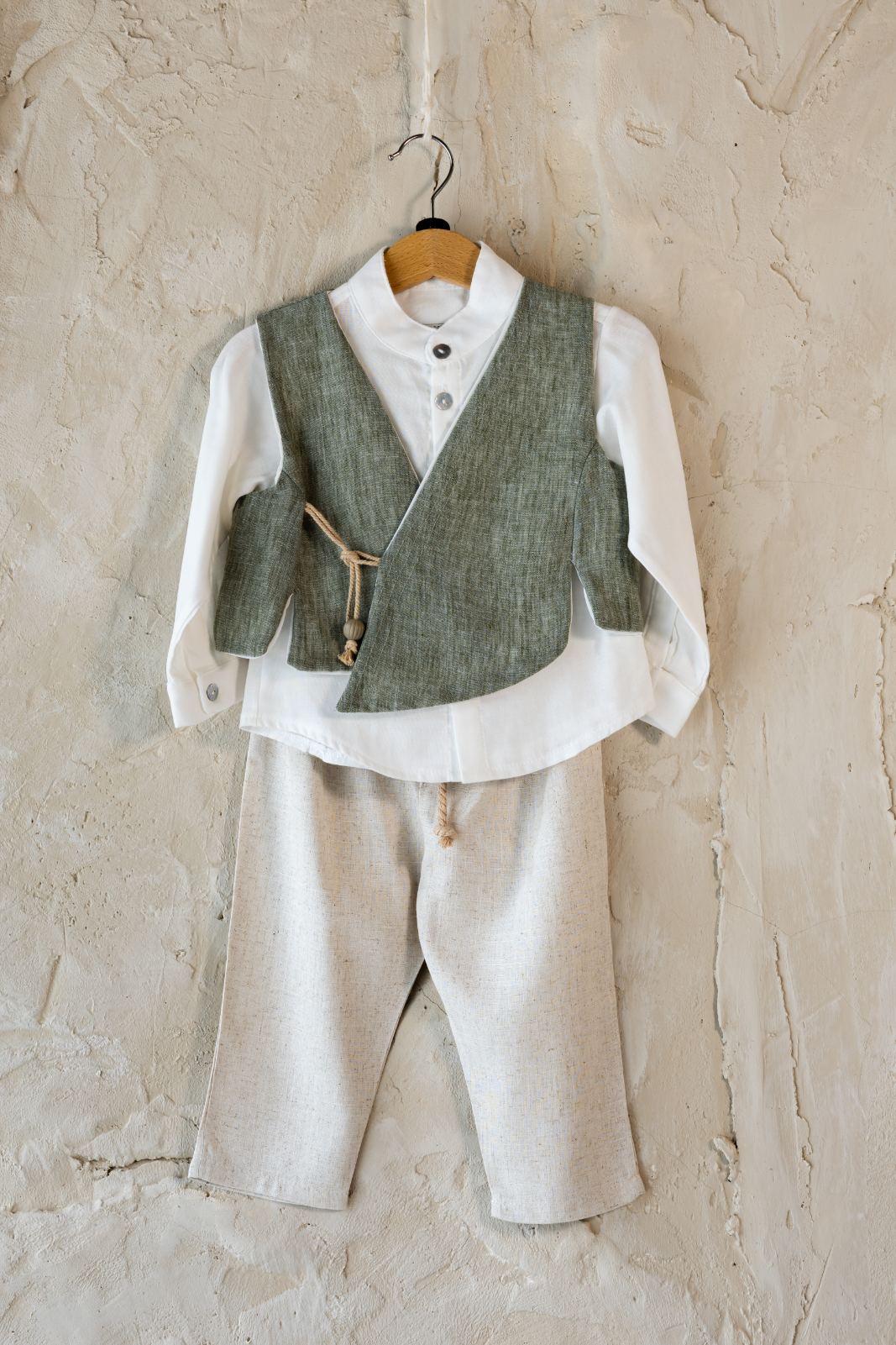 Το βαπτιστικό κουστούμι Ralph ξεχωρίζει για τον φυσικό του χαρακτήρα και τις χειροποίητες λεπτομέρειες που κάνουν τη διαφορά. Είναι η ιδανική επιλογή για βαπτίσεις με θέμα τη φύση, το rustic ή το bohemian στυλ.