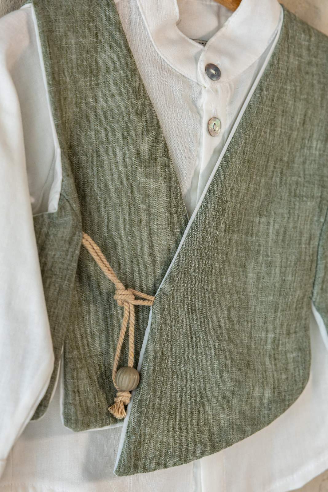 Γιλέκο: Σε ιδιαίτερη απόχρωση του πράσινου (sage green), με ασύμμετρο κλείσιμο και διακοσμητικό σχοινί με ξύλινη λεπτομέρεια που προσδίδει έναν organic χαρακτήρα.