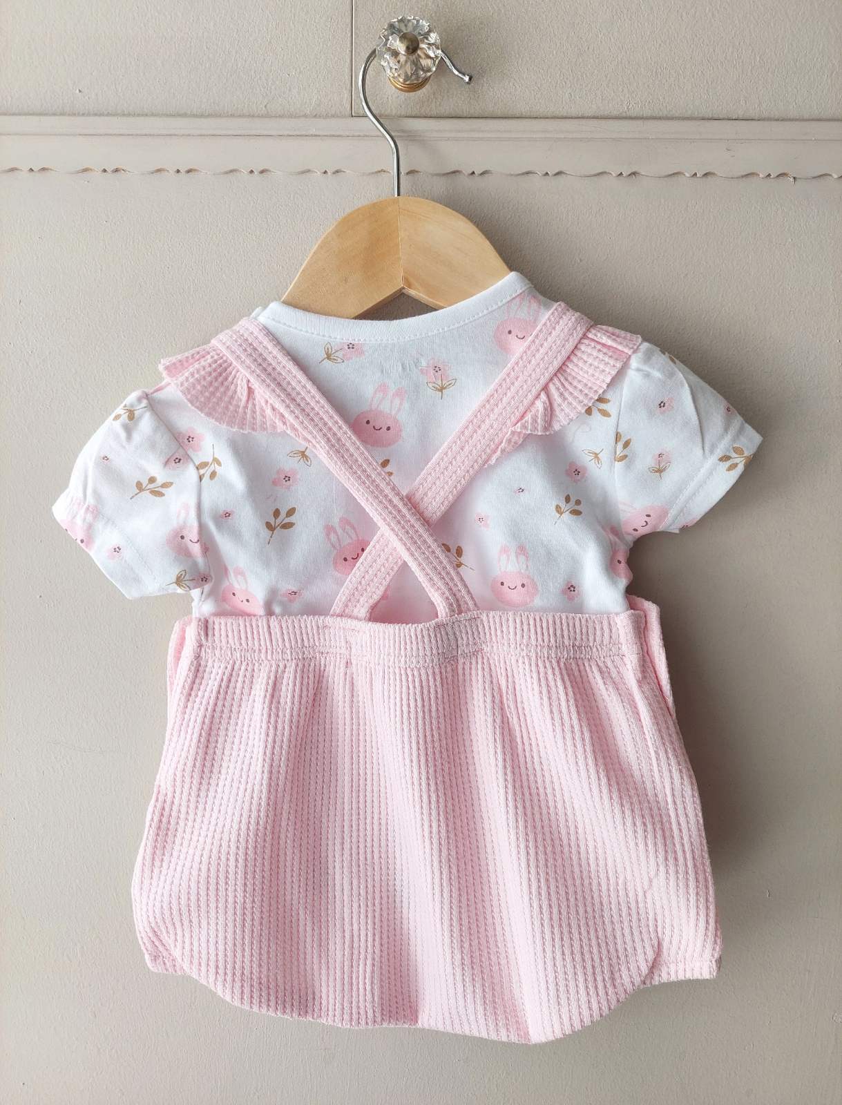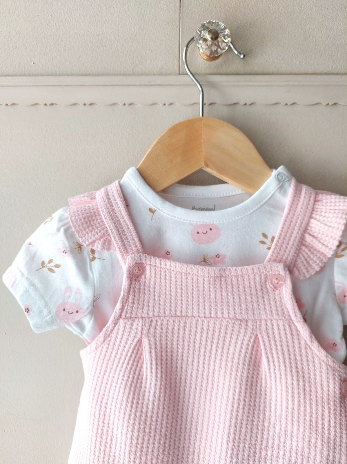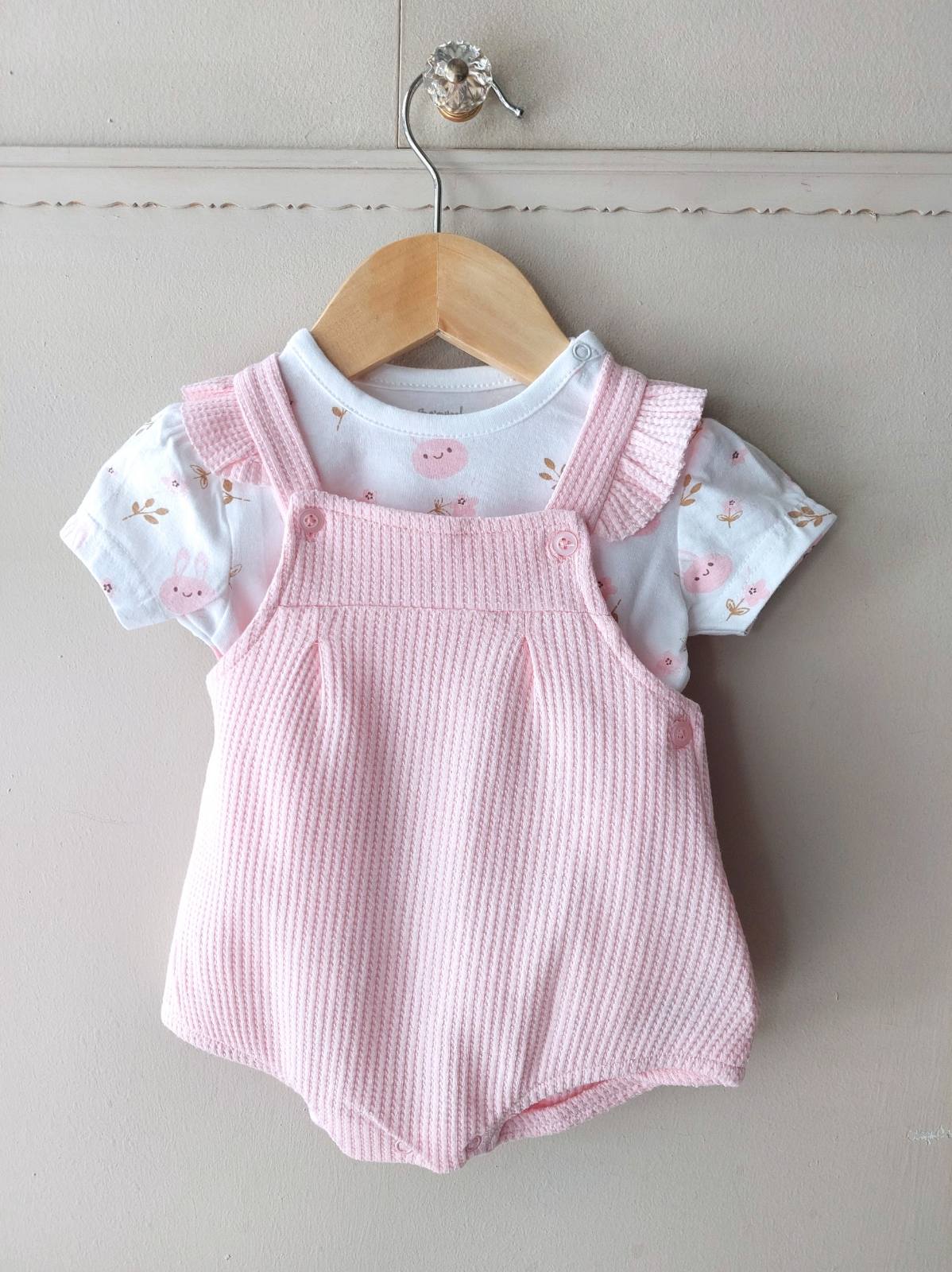 Το σετ περιλαμβάνει ριμπ πλεκτή σαλοπέτα σε απαλό ροζ και βαμβακερό κοντομάνικο φορμάκι με παιχνιδιάρικα σχέδια.