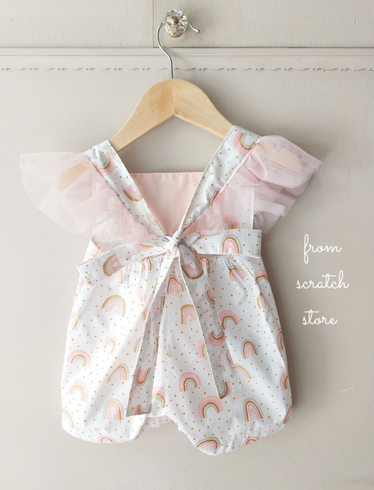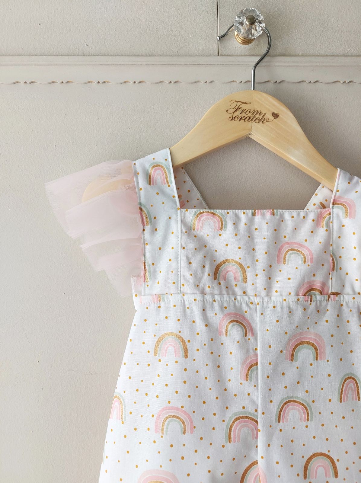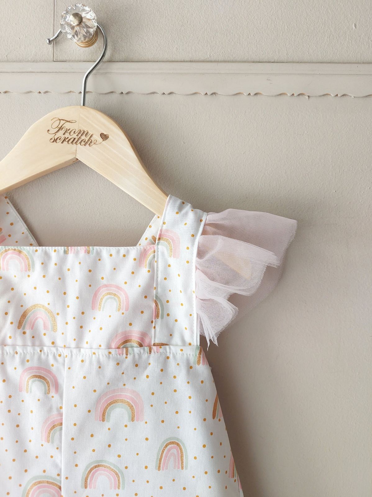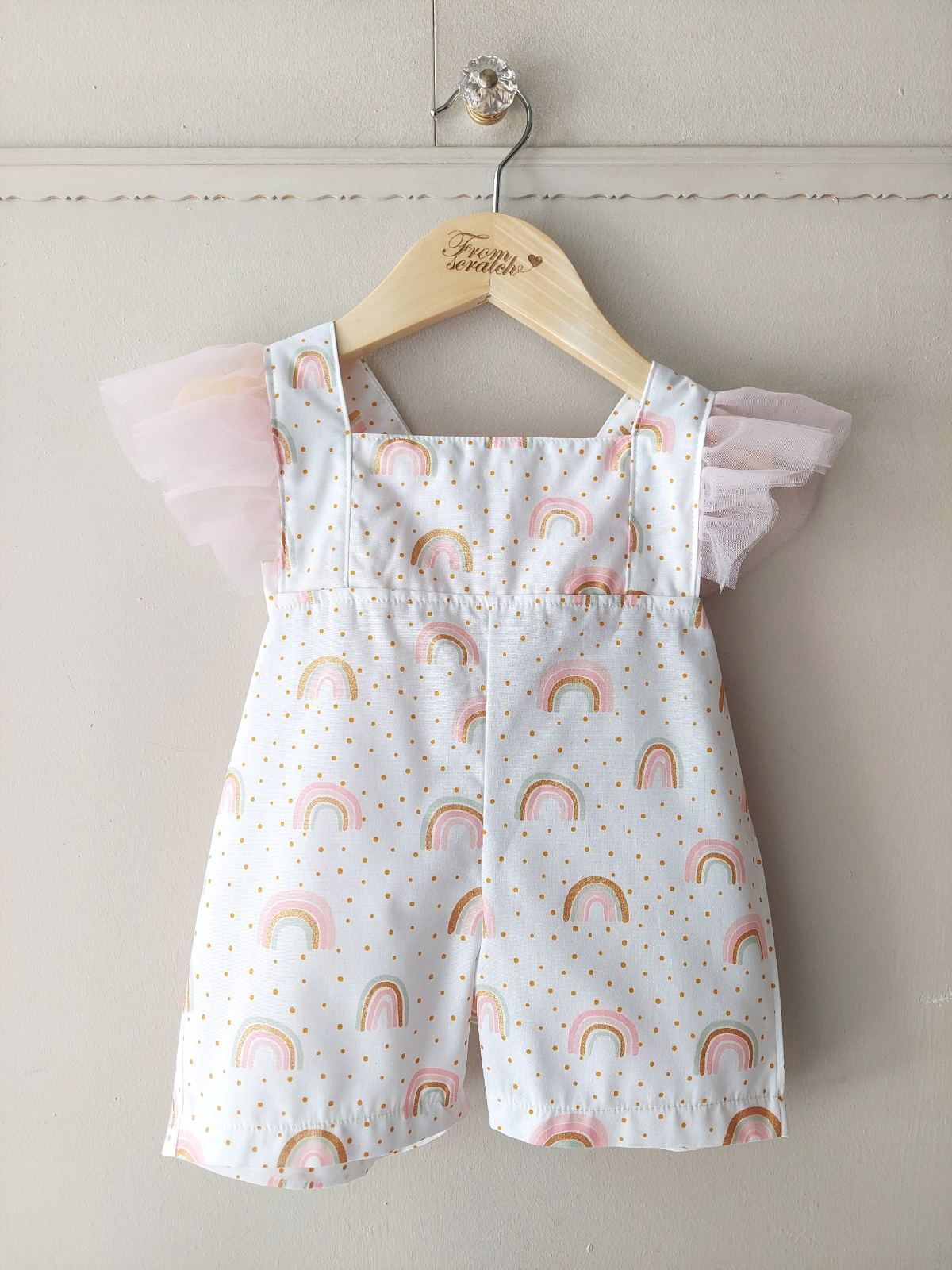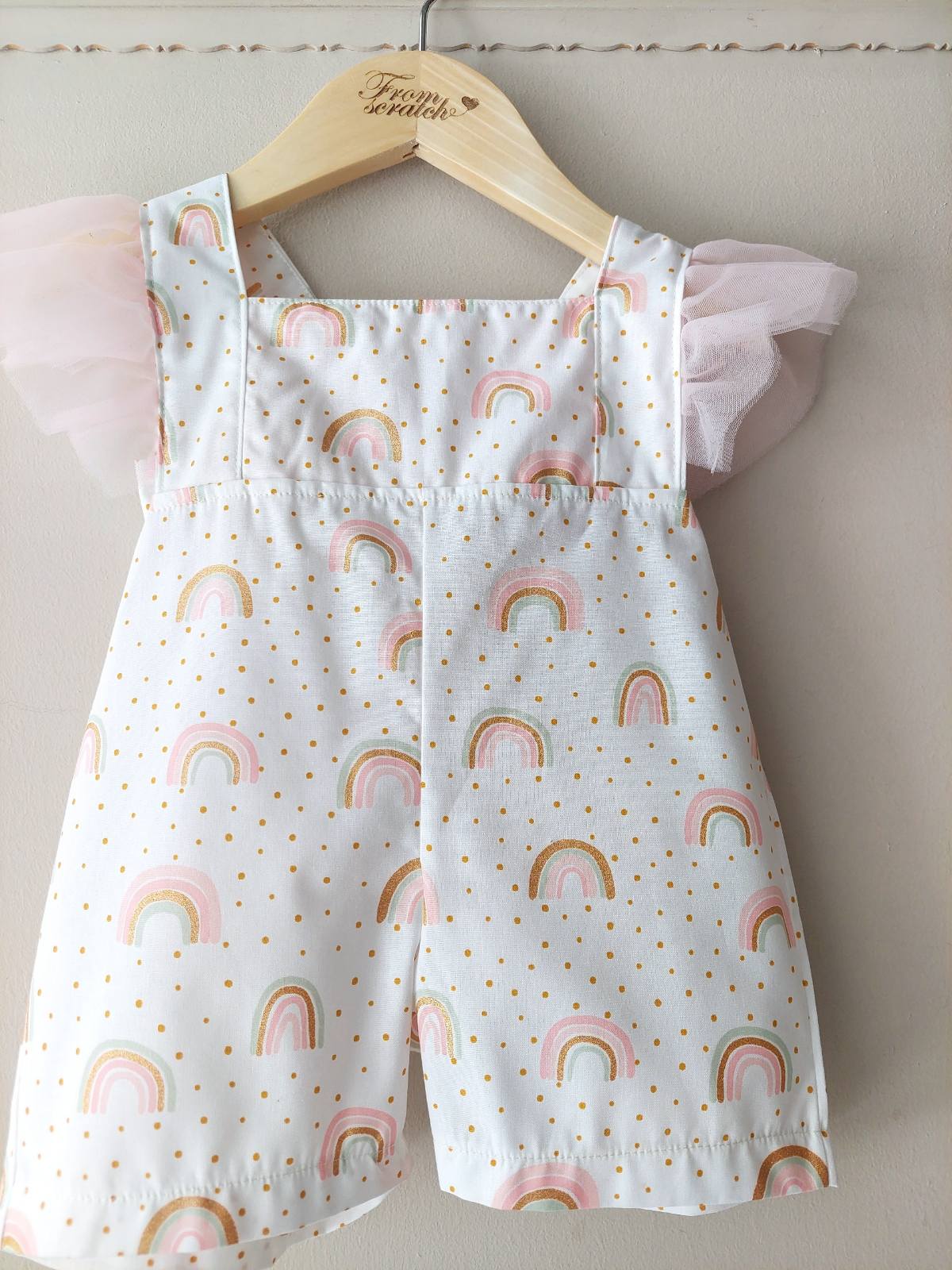 με γλυκό μοτίβο ουράνιου τόξου και χρυσαφένιες πουά λεπτομέρειες.