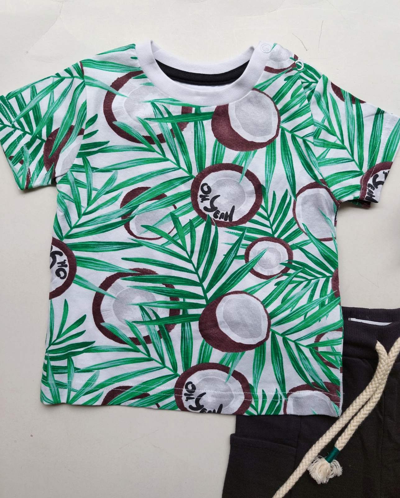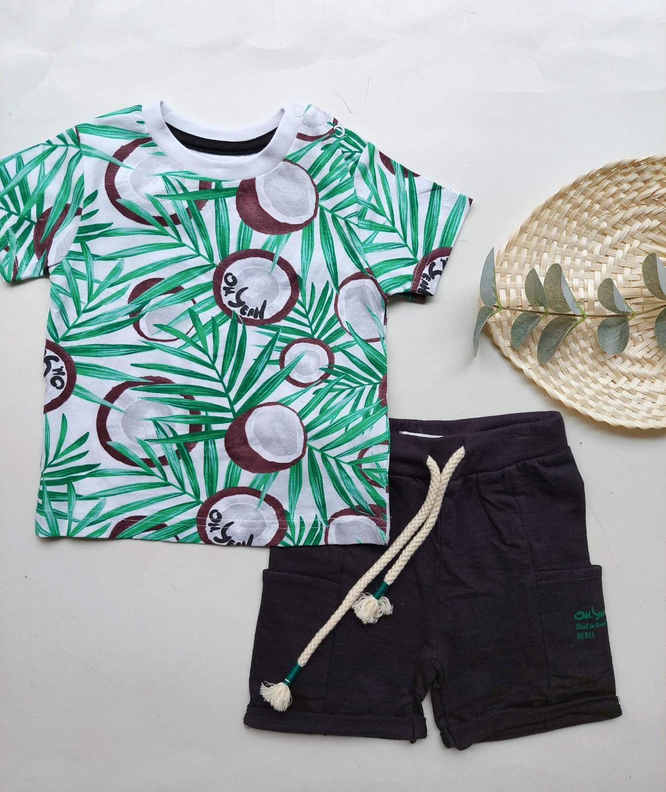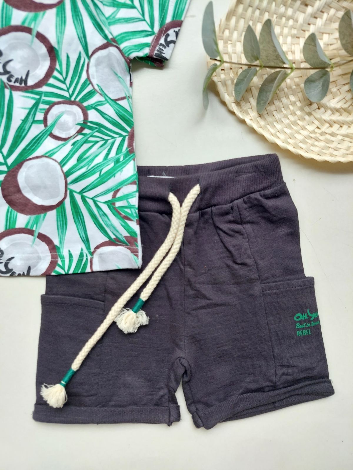 Άκρως καλοκαιρινό αυτό το σετακι περιλαμβάνει εάν άνετο jersey shorts και τέλειο jersey tshirt με print καρύδες.