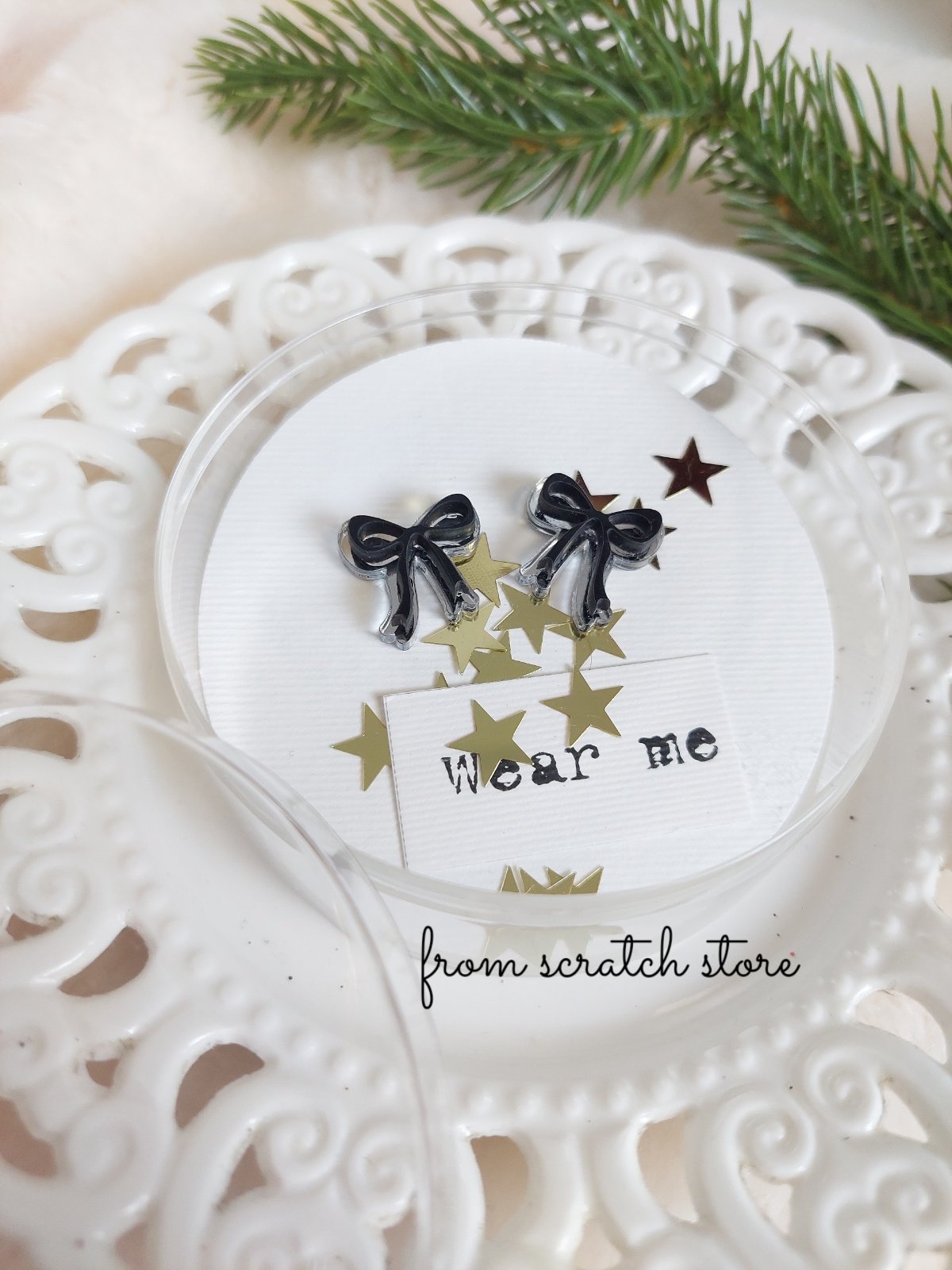 Σκουλαρίκια Bows Black είναι μια διακριτική, κομψή και διαχρονική επιλογή. Τα σκουλαρίκια διαθέτουν τη φιγούρα ενός χαριτωμένου φιόγκου σε μαύρο χρώμα με διακριτικό γκλίτερ ή λάμψη. Είναι φτιαγμένα από ανθεκτικό υλικό και αποτελούν ένα κομψό αξεσουάρ, ιδανικό για να προσθέσει μια βραδινή ή επίσημη πινελιά σε κάθε εμφάνιση.