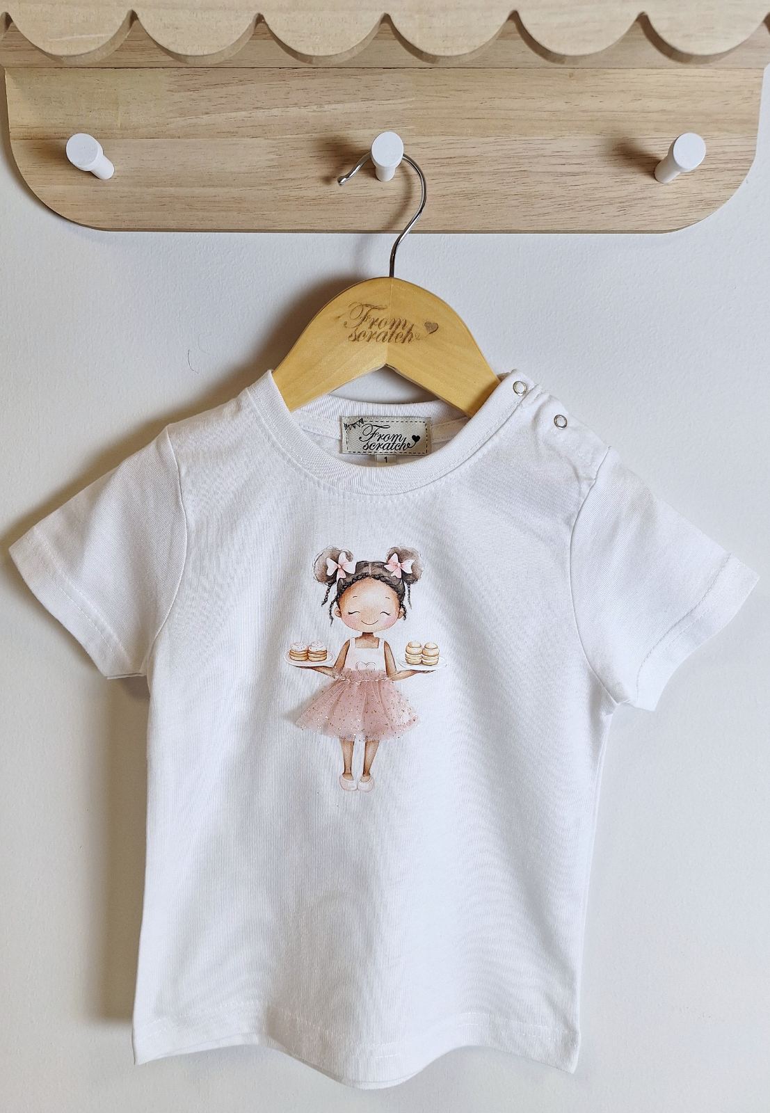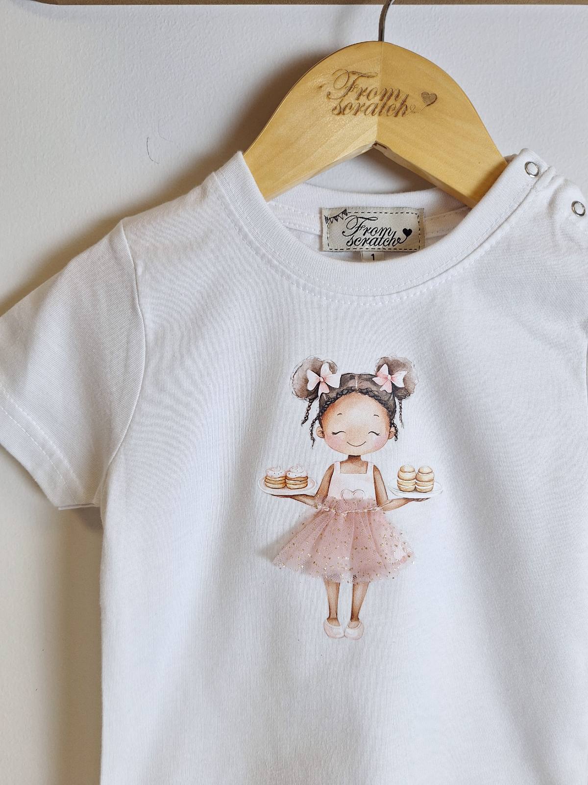 Δώστε μια παραμυθένια νότα στο ντύσιμο της μικρής σας με το λευκό βαμβακερό T-shirt “Cupcake Girl”. Το σχέδιο απεικονίζει ένα χαμογελαστό κοριτσάκι που κρατάει δίσκους με λαχταριστά cupcakes, φορώντας μια εντυπωσιακή τρισδιάστατη (3D) ροζ φούστα από γκλίτερ τούλι. Οι λεπτομέρειες με τα ροζ φιογκάκια στα μαλλιά ολοκληρώνουν αυτό το μοναδικό, ανάγλυφο αποτέλεσμα.