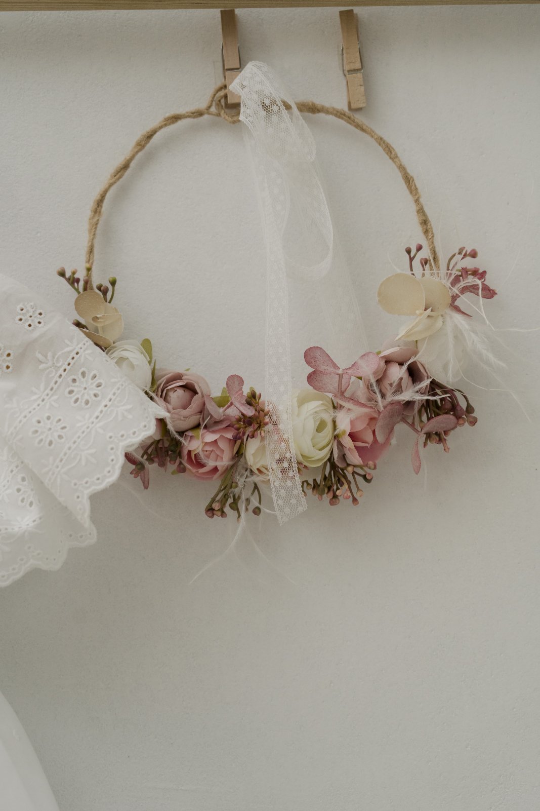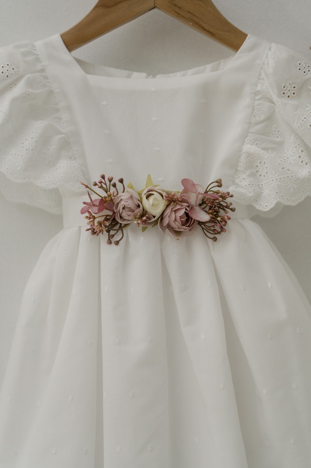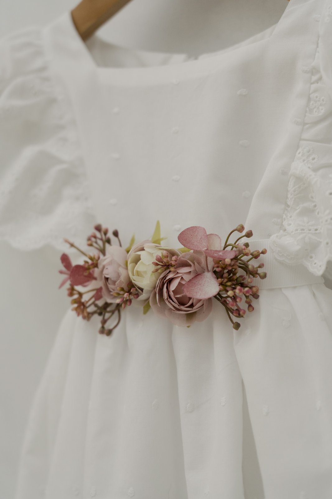 Το υπέροχο φορεματάκι μας κλείνει στη μέση με μια εντυπωσιακή ζώνη από λουλούδια όπως και το κεφαλάκι κοσμεί ένα στεφανάκι.