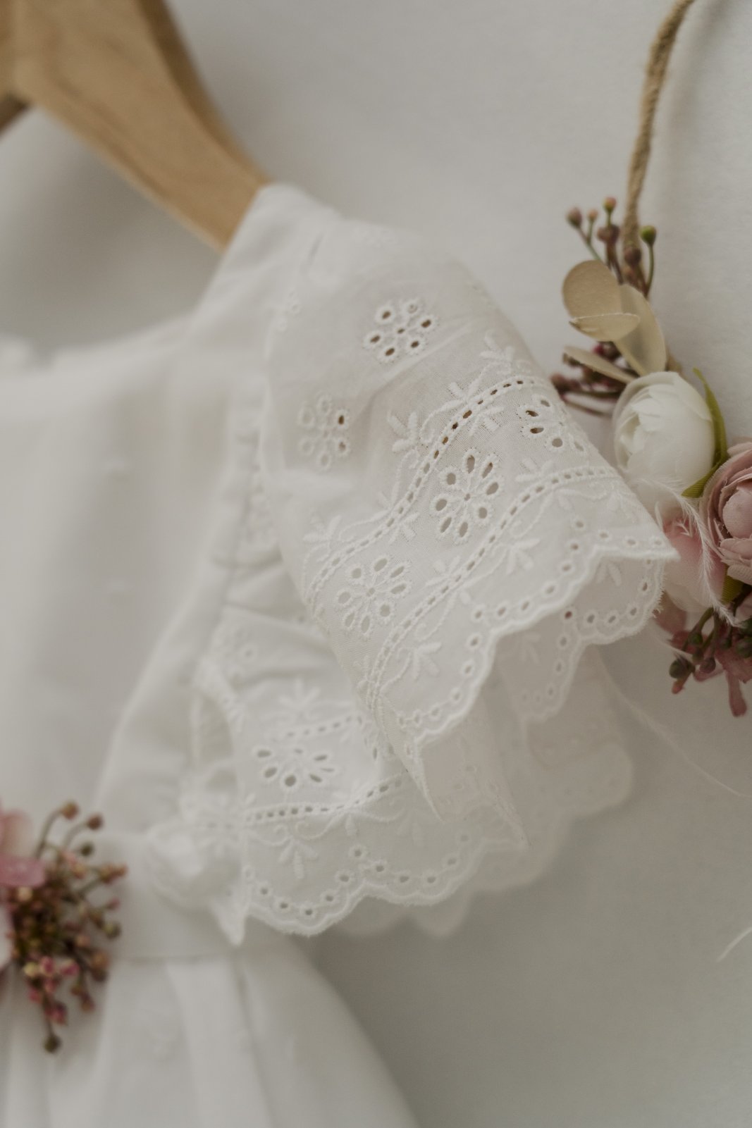 Είναι όλο φτιαγμένο από κεντητό βουαλ ύφασμα με broderie anglaise δαντέλα στο τελείωμα και τα μανίκια.