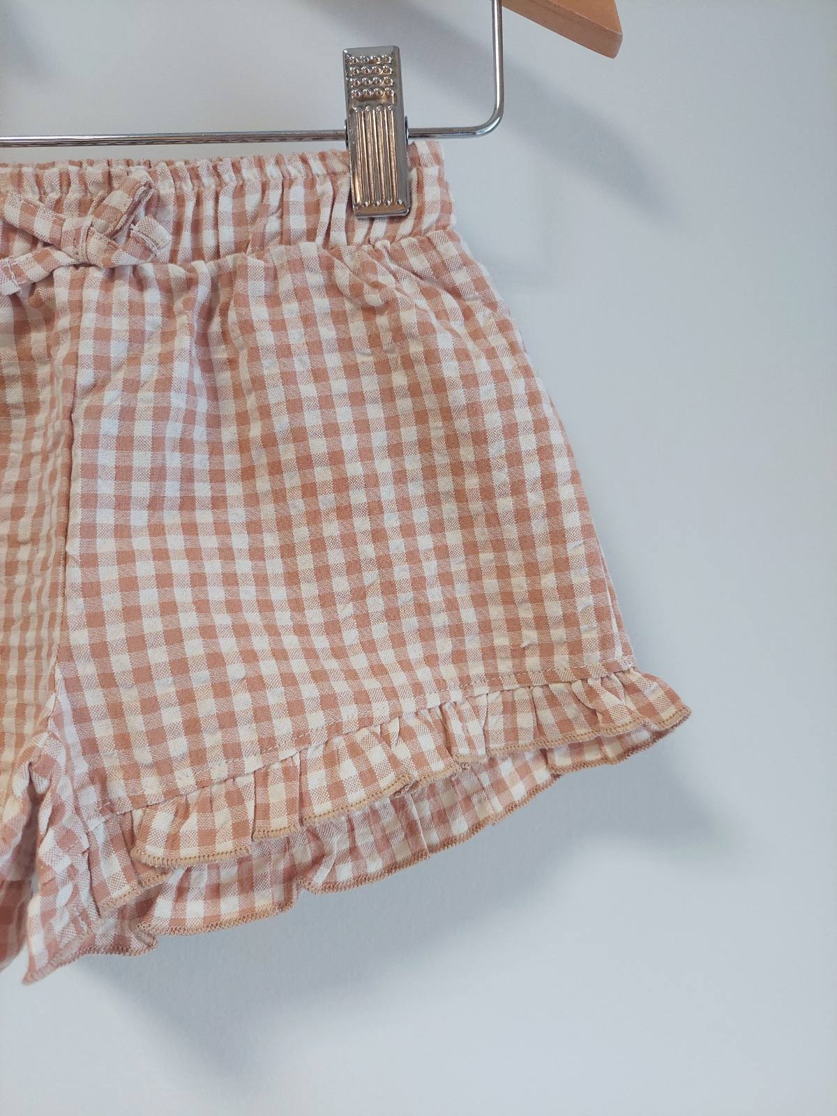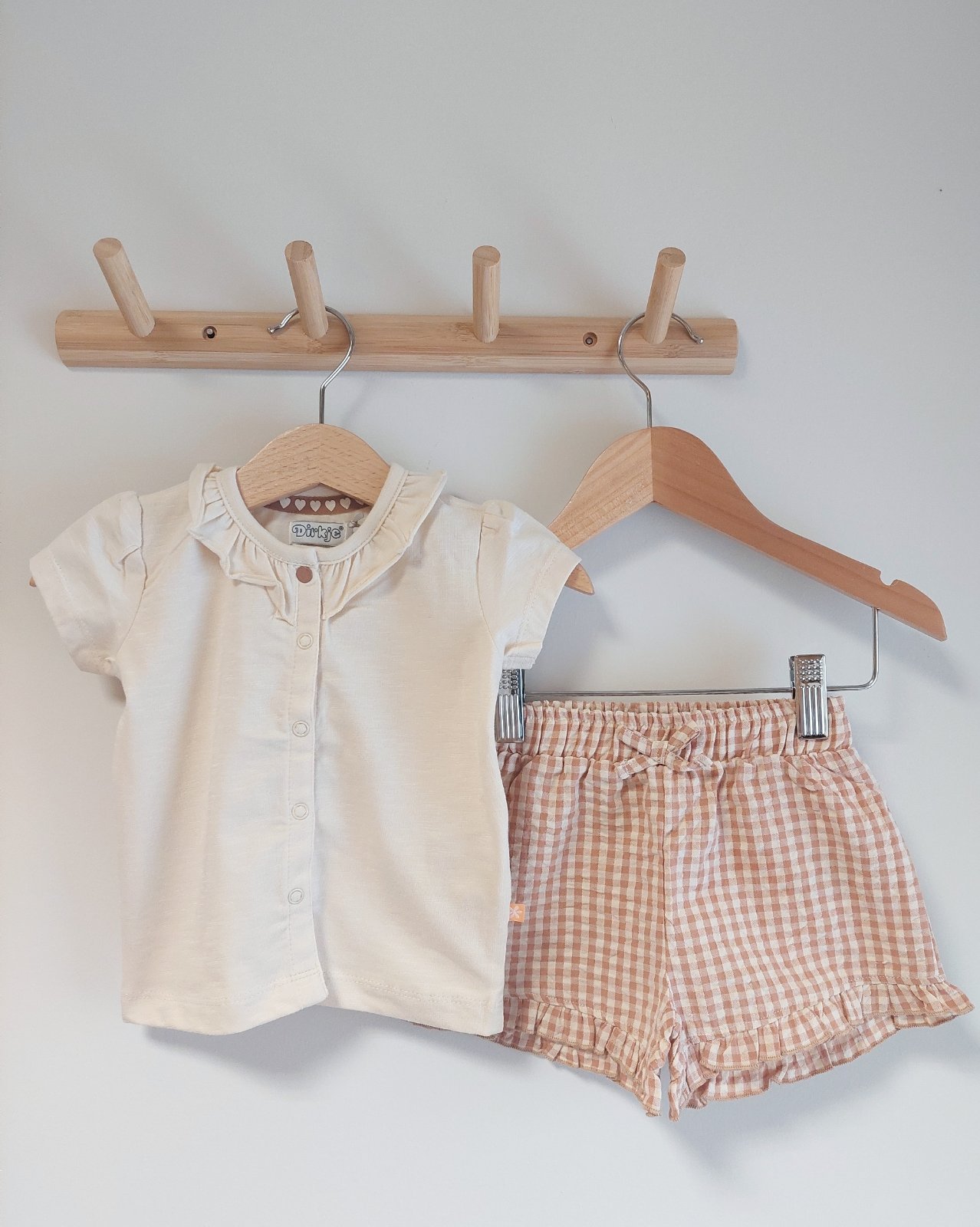 Εύκολο…καθημερινό περιλαμβάνει ένα ελαστικό jersey μπλουζάκι με βολάν στην λαιμόκοψη κ ένα υπέροχο καρο σορτσάκι με λάστιχο στη μέση κ βολάν στο τελείωμα του.