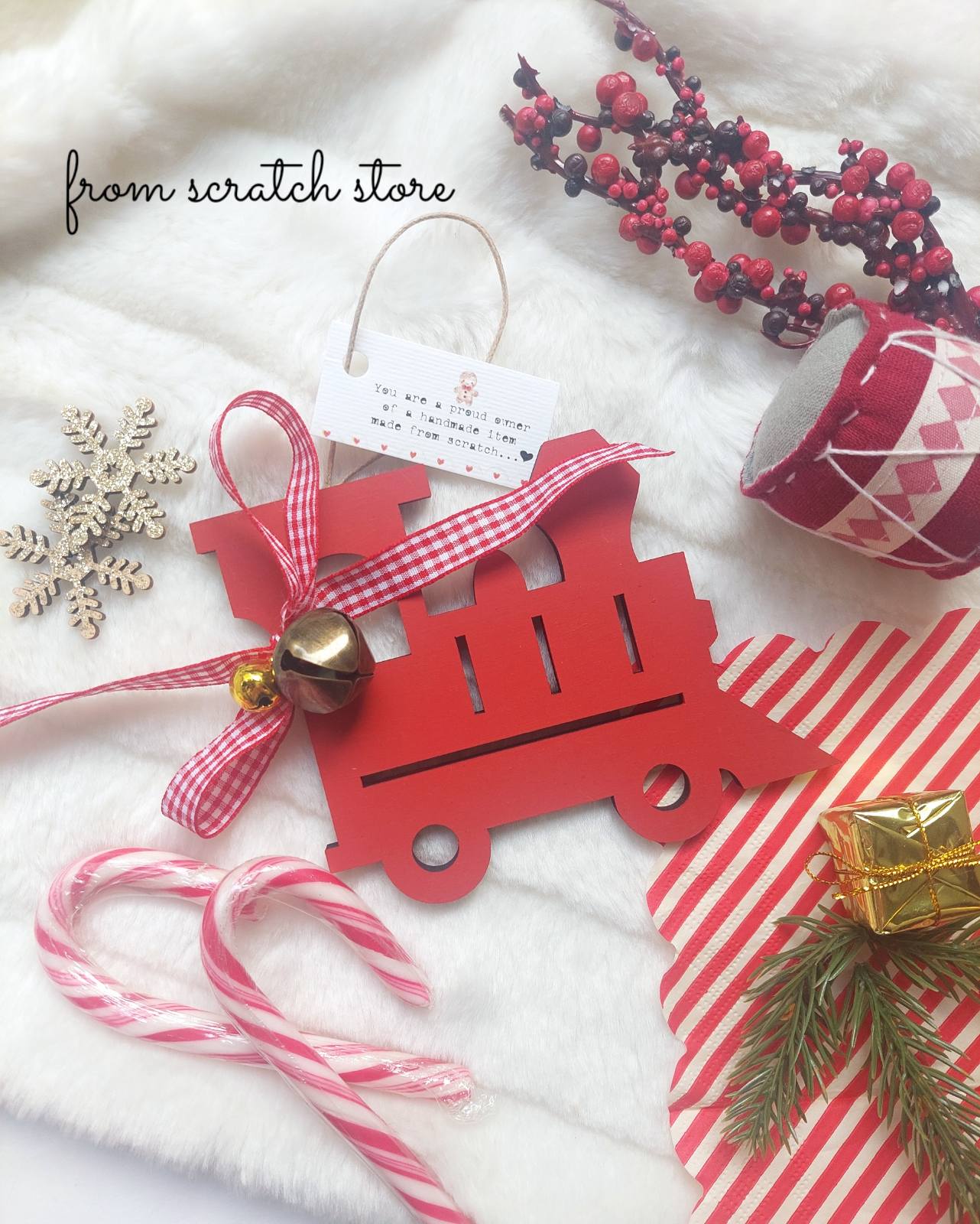 • Σχέδιο: Κλασικό κόκκινο τρενάκι με καρό κορδέλα και μεταλλικό κουδουνάκι